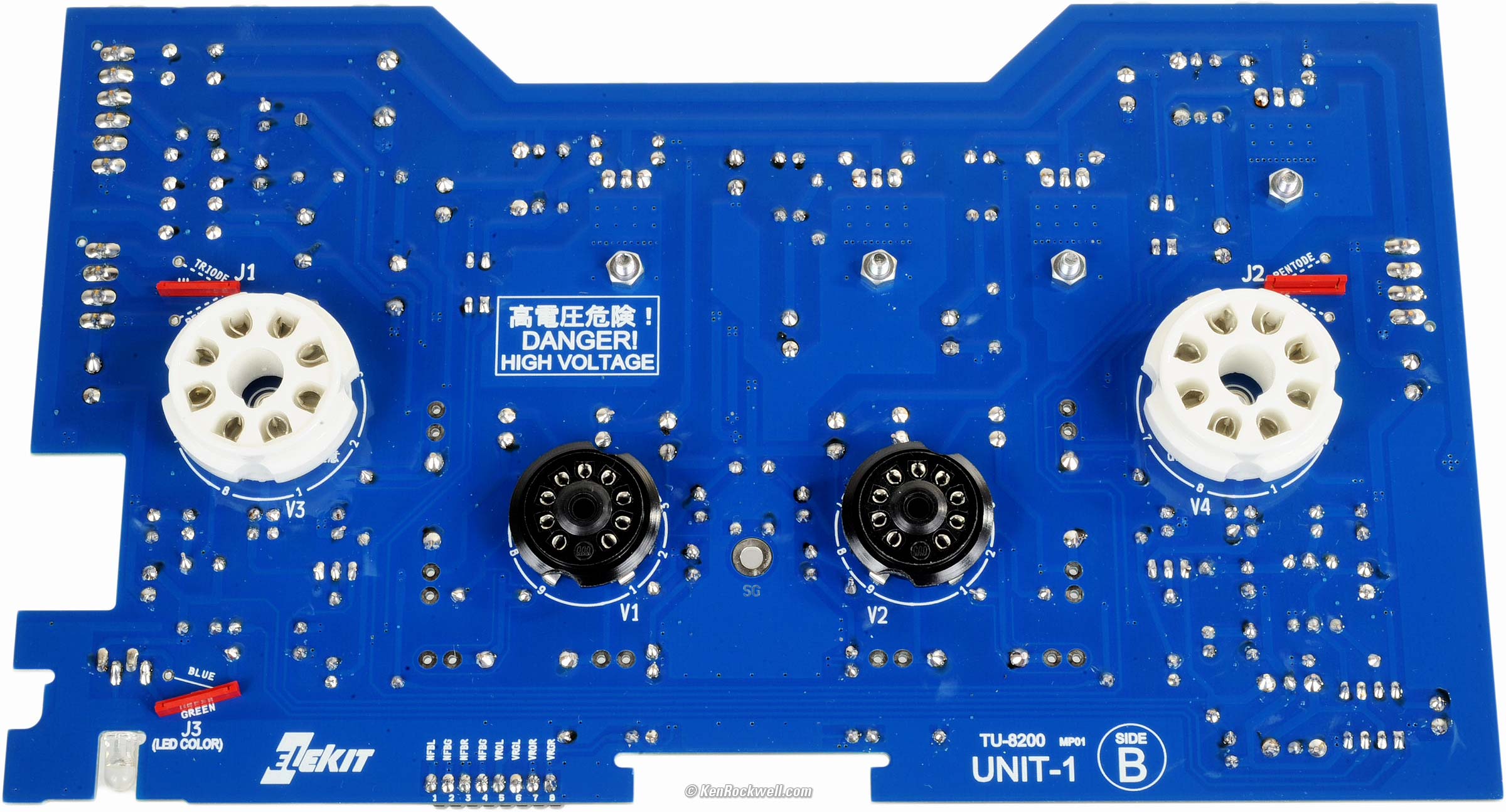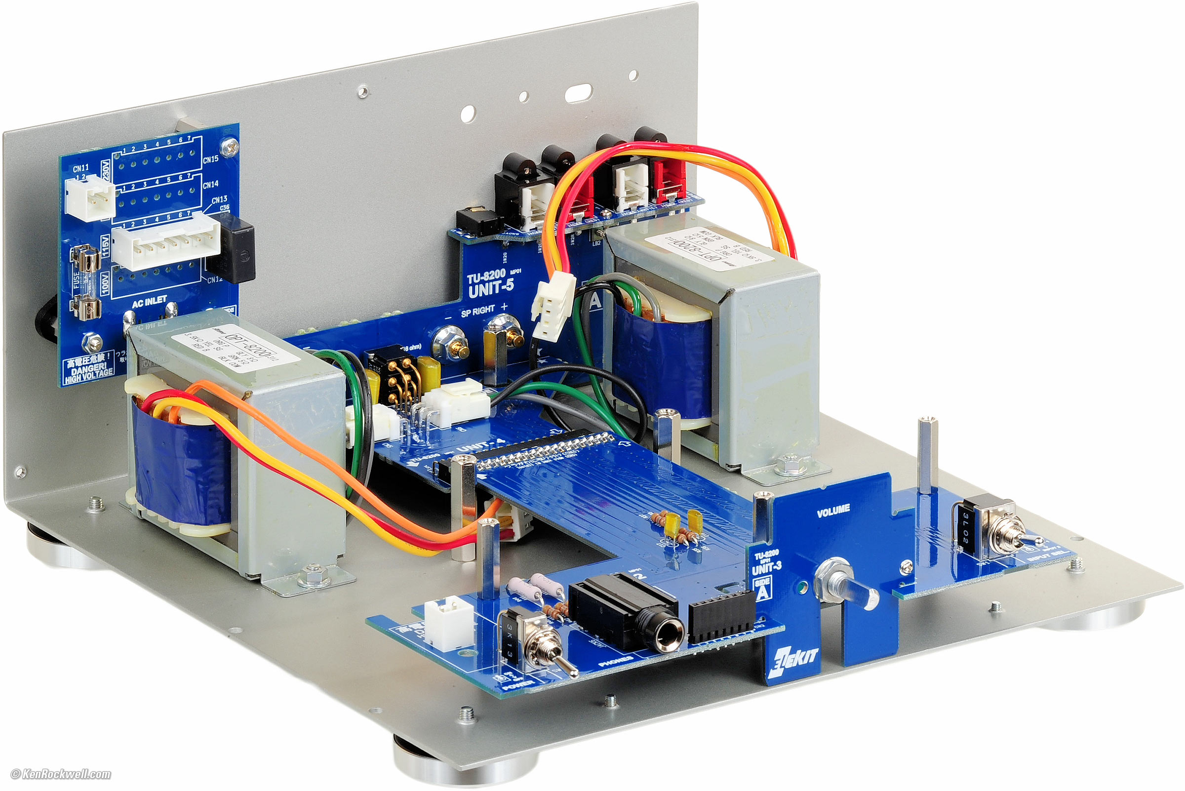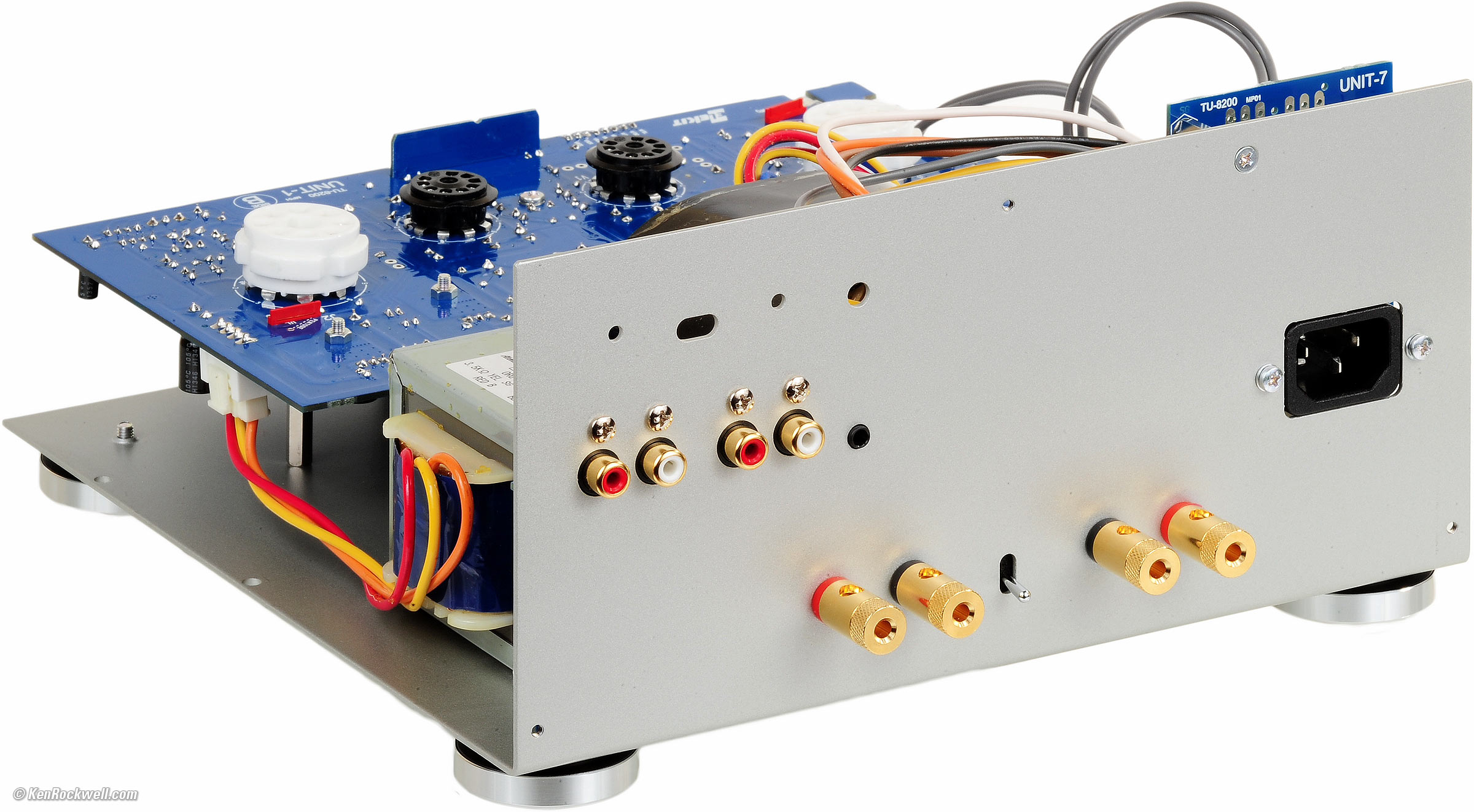 Assembly top Intro Specifications Assembly Measurements Performance Usage Recommendations More Remember when people had hobbies, like photography, working in a darkroom, building model planes and building electronic kits for when we had rainy and snowy days? I sure do, and I loved assembling this kit. The kit presumes you know how to solder well and work with tools. What struck me as super fun is that for the past 30 years I've been having to design and build all my own gear from scratch. A kit is fun because the work's already done. With a kit, you've got a box of everything you need, so you just steam ahead without having to design and source everything. Much different from 35 years ago is that the parts are much nicer what was included with American Heathkits and Hafler kits, and that the instructions expect that you already know how to solder. Another huge difference is that there's no chassis wiring. All the power and chassis wiring is done by soldering edge connectors to the boards, and then plugging-in pre-assembled cables. This way it's nearly impossible to wire it incorrectly. Compared to the Hafler DH-200 kit I built in 1980, this kit is sort of inside out. The Hafler included completely assembled, calibrated and tested circuit boards and amplifier modules; you merely assembled the modules to the chassis and wired the power supplies and audio connections. In this kit, you assemble the circuit boards but the input/output and power wiring is all done for you with the supplied plug-in wiring harnesses. Except for the electrolytic capacitors, the LED and bridge rectifiers, it seems everything that needs to go in only one way only goes in one way. Everything is clearly called out, so it will be difficult to make any big mistakes if you pay attention. Luckily all the electrolytic capacitors are oriented the same way on the board, so it's easy to inspect your work and avoid any surprises later (electrolytics usually explode when put in backwards). Everything, even the tubes, is included, so all you need is a hot soldering iron, basic tools and solder for an evening or afternoon spent actually making something. I was amused that one surface-mount part was included, the 3.5mm jack, and it was trivial to solder it to the board. It uses solder bridges to connect between some boards. This struck me as weird, since I'm used to building battleships for the US Navy that need to take explosive blasts and still come up fighting, but considering how well all the boards are braced and presuming you use the correct 60/40 lead alloy solder, should last forever in home use. It seems that very few lock washers are used. I'll presume that this amplifier is designed correctly not to fall apart after years of use, but if I designed it, I'd use more lock washers. I'd also use some fish paper behind the power inlet; it seems to have closer clearance than I'd like between its solder connections and other part of the amplifier. It uses solid metal spacers to hold the boards to the chassis. The big rubber feet are very nice, and should be just fine for use on fine wood furniture. The instructions are perfect: everything is extremely clear and well explained. Presuming you already know the basics, the instructions call out everything specific you need to know, and especially call out some items that need special attention to assemble correctly. I realized later something unusual: it was actually much clearer and easier to assemble this amplifier than to assemble most of my kids' toys, since the instructions for my kids toys are usually much less clear and much less well written. The parts are very well organized in their little clear plastic bags. Assembly proceeds very logically and it's easy to find everything as you go — much easier than looking in the brown paper lunch bags used by Heathkit. HINT: Use a Sharpie to write the size of hardware on each bag, like M3 x 6, which will save you from having to look up their sizes each time. This kit presumes you've built things before; I've been building kits for over 40 years and I appreciate that the instructions call out everything specific to assembling this amplifier correctly the first time. Unlike other assembly projects, it's written clearly enough so that it's unlikely that you'll accidentally put something in the wrong place or miss something subtle and not realize your mistake until later. Since you're providing the solder (every electronics man has a roll at home), you can use real 60/40 tin/lead solder so this amplifier lasts for many, many decades. Don't use RoHS (lead-free) solder, since that's only for products designed to be sold worldwide into Socialist and Communist countries with deliberately restrictive regulations. Lead-free "junk" solder is brittle and develops tin whiskers, greatly shortening the life of products in which it's used.