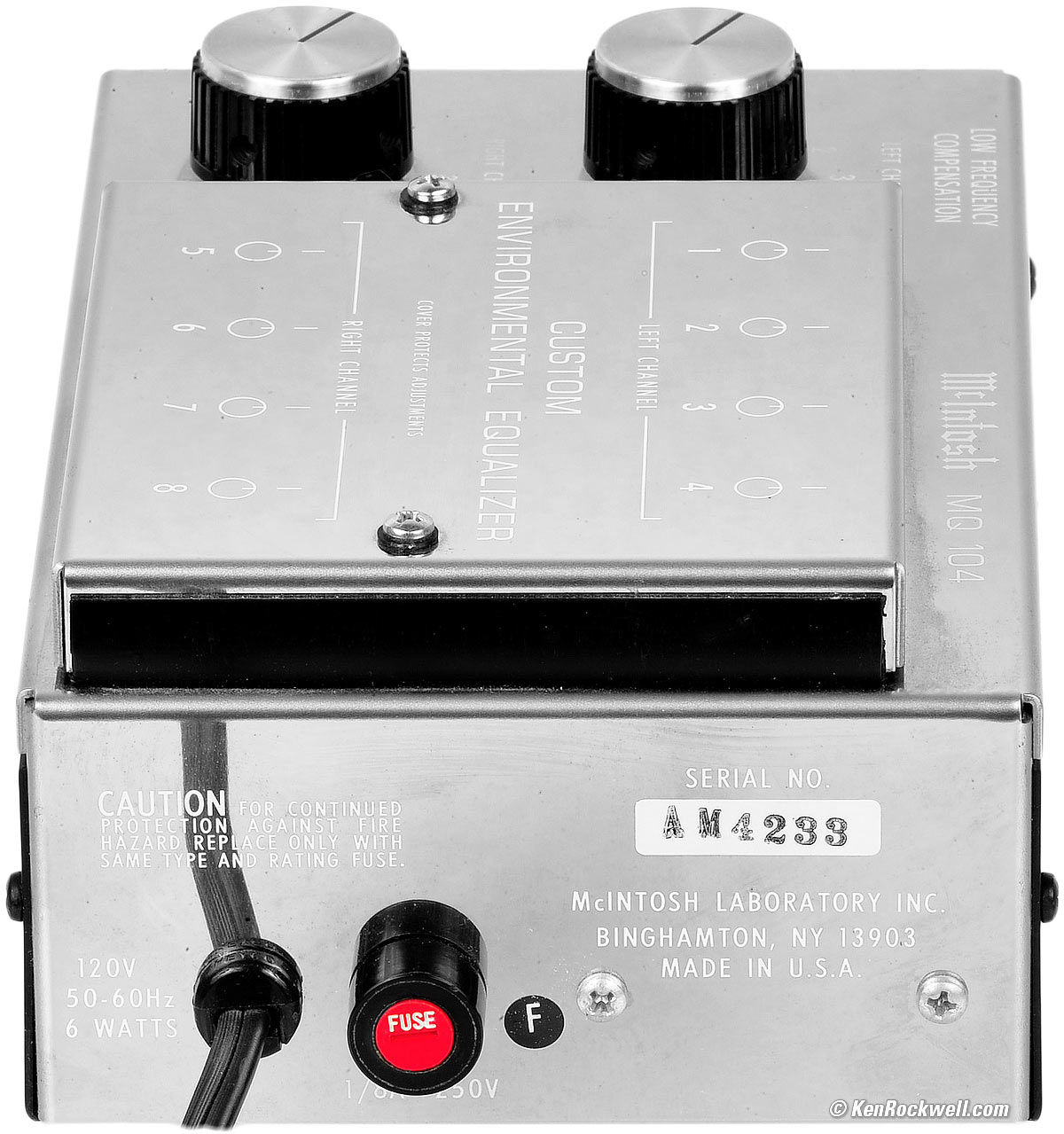 Introduction top Intro Specs Measurements Recommendations More The McIntosh MQ 104 is a dedicated equalizer to optimize low-frequency response of certain McIntosh loudspeaker systems, as well as programmable four-band per channel third or full octave equalizer. It came out around 1980. It is intended to be set-up with instruments, and then hidden away. The cover minimizes der fingerpoken. Each channel has four selectable levels of low-frequency boost, or sets flat. These only boost below 100 cycles and boost strongly down to 20 cycles. A 14-cycle infrasonic filter rolls-off response below 20 cycles. Each of the four programmable third- or full-octave bands may be set to any frequency and set to third or full octave bandwidth using the included set of plug-in capacitors. For instance, with my B&W 801, while I use a 33-band third-octave equalizer, I only use the 16, 25, 40 and 8,000 cycle bands along with a dedicated compensation filter I designed to get flat response to 16 cycles, meaning that the four bands of this equalizer are actually all I need. It has a mute relay with a 2.2 second turn-on delay. The EQ IN-OUT switch neutralizes the four hidden, center-detented rotary potentiometers of the 4-band programmable equalizer. The IN-OUT switch does not bypass this equalizer and does not cancel the low-frequency boost selected with the knobs.