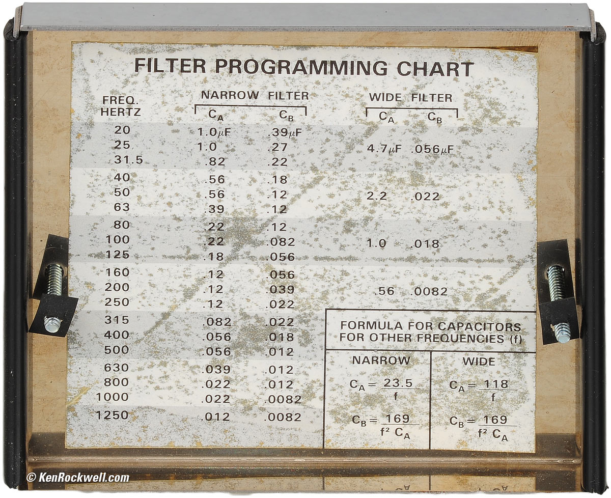 Programmable Filters McIntosh MQ 104 programmable filters. enlarge. 4 programmable filters per channel. Each is independent and may be programmed for standard 1/3 octave center frequencies from 20 to 1,000 cycles with the set of included plug-in capacitors. Lead spacing for plug-in capacitors: 0.3" (5/16" or 7.62mm) Bandwidth is programmable for 1/3 or one octave. ±12 dB narrow. ±15 dB, wide. Controls detented at zero. McIntosh MQ 104 filter programming chart (inside lid). enlarge. 8,000 cycles: 0.00294 µF & 900 pF narrow; 0.0148 µF & 179 pF wide. 16 cycles: 1.47 µF & 0.45 µF narrow; 7.38 µF & 0.0895 µF wide. 12.5 cycles: 1.88 µF & 0.58 µF narrow; 9.44 µF & 0.115 µF wide.