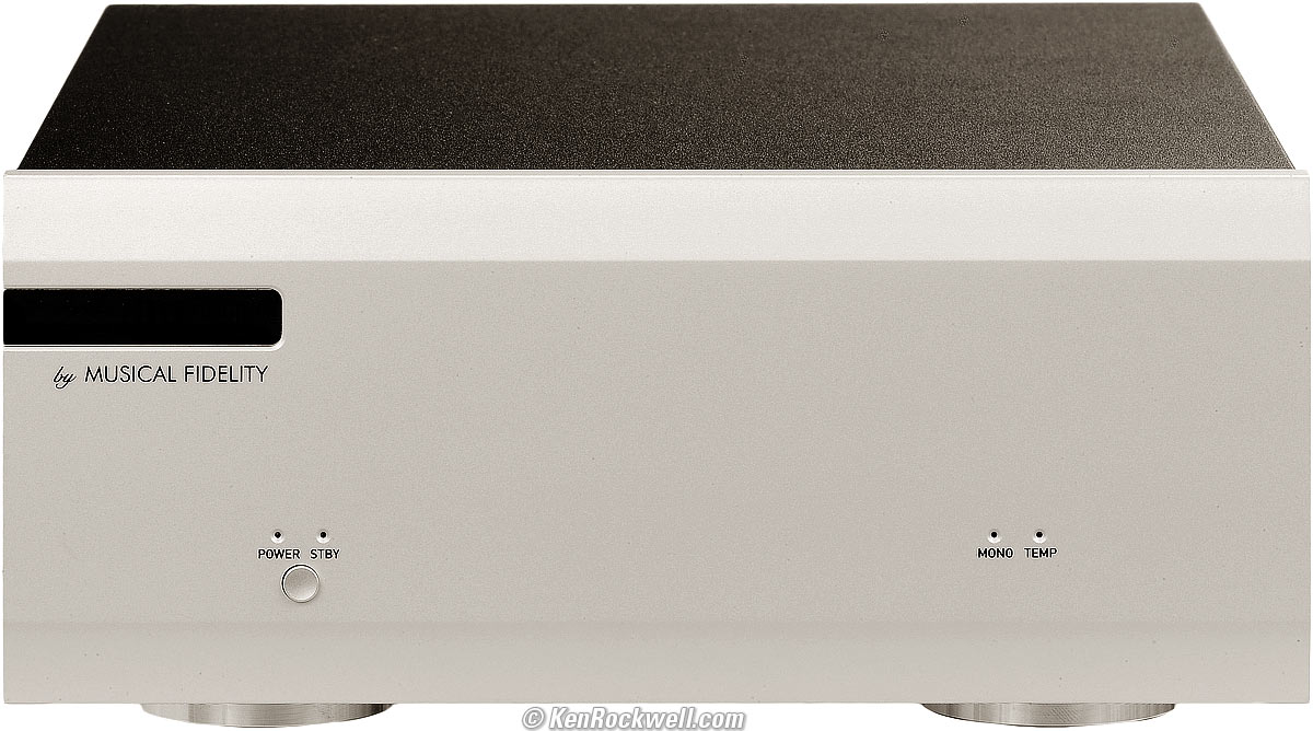 Recommendations top Intro Specifications Sound Measurements Usage Recommendations The M1PWR excels for first-class power amplification when size, weight and power consumption matter. Not only will you save a little on your power bill, in the summer you'll also save a little on your cooling bill. The M1PWR excels where power consumption, size, weight or heat loading is important. If you're running on solar power on your yacht, need a first-class high fidelity system in your aircraft or want to improve on the dinky amplifiers in your whole-house remote-controlled audio system, the M1PWR is your amplifier. Personally I see use for this amp in my office, where my class AB amplifiers heat up my office and demand too much air conditioning. My wife hates it when our whole house is chilled to 64ºF just so my working office is bearably cool with all my equipment running. I also see it as ideal to power our backyard system, where I won't feel guilty leaving the M1PWR on 24/7 so I can play into it from our whole-house or AirPort Express system. Heck, for those who appreciate fine motorcars, power consumption is low enough that you easily can power this from a DC power inverter, and run them in your automobile. If you need the absolute best-sounding amplifier for a reference system, I slightly prefer the sound of my huge traditional ADCOM GFA-555 II, and Musical Fidelity of course makes many fine class AB and class A amplifiers, like the Musical Fidelity M6 500i (500 WPC integrated) for a few thousand dollars, the M8700M (700WPC dual-mono) for $12,500 or their best AMS100 100W class A dual mono amplifier for a mere $20,000. With this M1PWR on sale today, you get 99% of the sound of a $20,000 amplifier for less than 3% of the price. Yes, I can hear a few fractions of a percent difference from perfection with this M1PWR as part of an unusually high-resolution and ultra wideband system, but it's highly unlikely that anyone else will hear anything amiss, and many may prefer the slightly added brightness, detail and improved transient response. The M1PWR is the least expensive amplifier from a company used to making five-figure amplifiers. The M1PWR sounds marvelous as part of an exacting reference system, especially if you prefer more detail. Enjoy! I just saved you $19,500 — and the M1PWR is even styled similar to the AMS100. If you find the time I invested researching and sharing this review, this free website's biggest support is when you use any of these links to get anything, and especially this link to the M1PWR at Amazon if you get some for yourself.