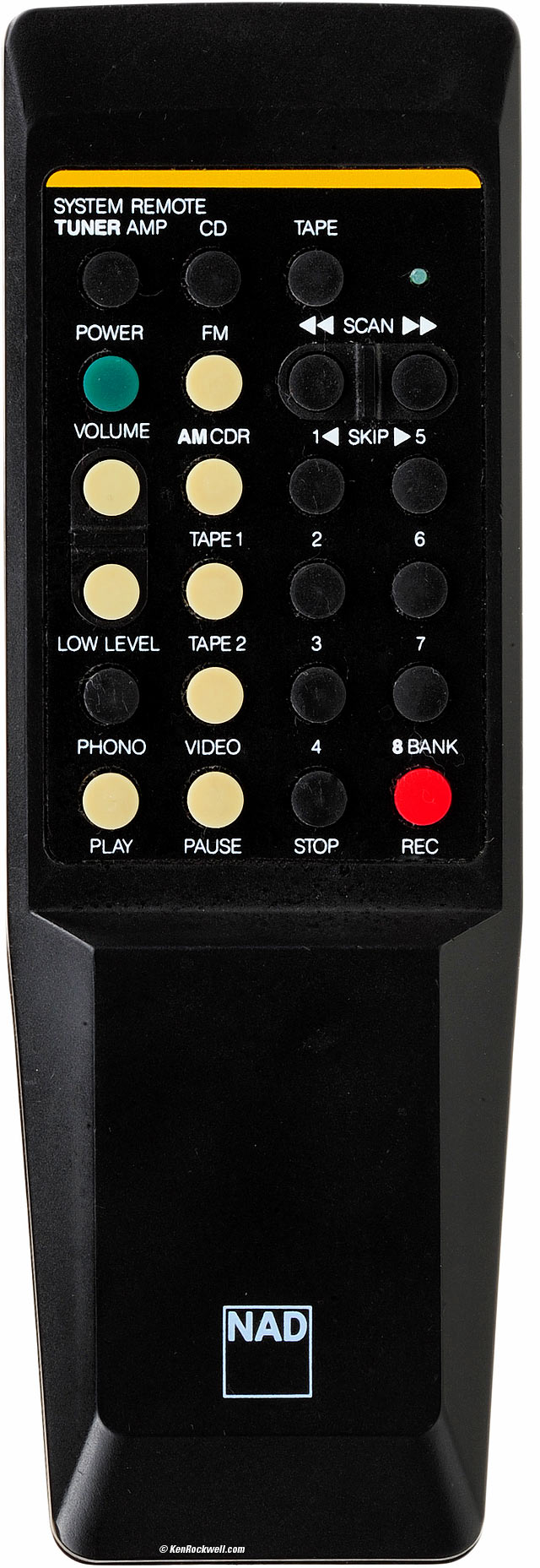October 2014 NAD reviews audio reviews all reviews Introduction top Intro Specifications Measurements Compared The NAD 7400 is a great-looking receiver that works as well as it looks. The reason I bought one used in 2014 is because it's big, well designed buttons and knobs make it fast and easy to get to my music, compared to the garbage sold new today that requires menus and fiddling to get anything adjusted. Every big button is clearly marked and does only one thing. One of the best things about this receiver, other than how it looks and sounds, it its tuning knob. It's the best of all worlds: it's a free-spinning flywheel knob that is opticoupled to a digitally synthesized tuner. This way it tunes and scans like a slide-rule-dial tuner (ten times faster than arguing with push buttons), and it has quartz-synthesized frequency accuracy. Older tuners lacked the tuning accuracy and precision, and newer ones got cheap with crummy UP - DOWN push buttons instead of the big flywheel knob. Likewise specific to NAD, earlier receivers tended to have crummy push terminals for the speakers (this 7400 has real banana post pairs), and newer NADs got rid of the clear, direct controls. These NADs were originally relatively inexpensive receivers that used clever design and off-shore manufacturing to extract great sound out of an inexpensive package. It has a metal face and push-on plastic knobs. No set screws here! The remote control is much more legible than others, and it's designed so that the infrared LEDs shine out the bottom as well as the front, so you can point the bottom or the front at the receiver as you read the buttons. NAD Monitor System remote control. enlarge. There are LEDs on the remote control to let you know it's transmitting, and another LED on the front face of the NAD 7400 to let you know it's receiving. Brilliant! The green power button is a long-push button that tells the computer to turn the power on or off. It's not a bigger switch actually handling the power itself as in older equipment. The FM tuner has an IF NARROW position to increase selectivity to allow receiving weak stations that are normally covered by stronger local stations. The FM tuner tunes in 50 kHz steps so you can detune to pick up a very weak station next to a very strong station. Stations in the USA are spaced 200 kHz apart. The 5-LED signal strength meter works great on both FM and AM. It will read lower than useless meters that usually read full-scale all the time. When it reads 3 out of 5, you've got a good signal. 4 is very good, and 5 is excellent. 2 is OK, 1 is getting weak, and none is weak. There are no overload lights for the power amplifier. NAD has all sorts of crazy soft clipping. There are loads of lights on the front panel when playing the radio, but only one or two LEDs lit when playing other inputs. All the tuner lights extinguish if you're not listening to it. All the push buttons have a relatively long throw. The speaker and BASS EQ buttons toggle in and out, while the others pop out after being pressed.