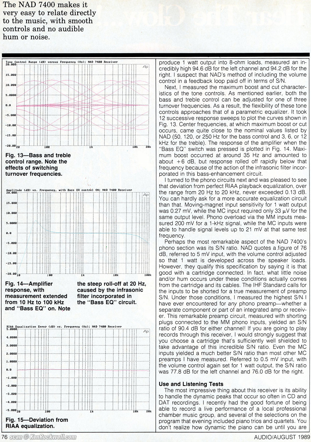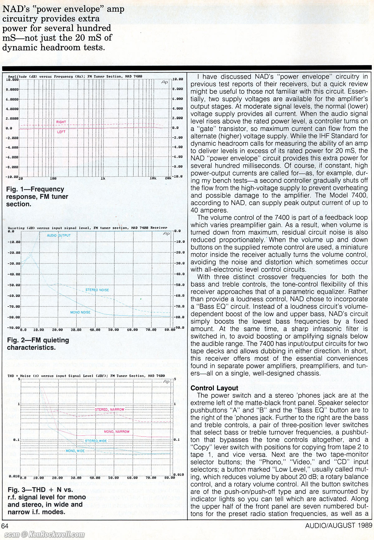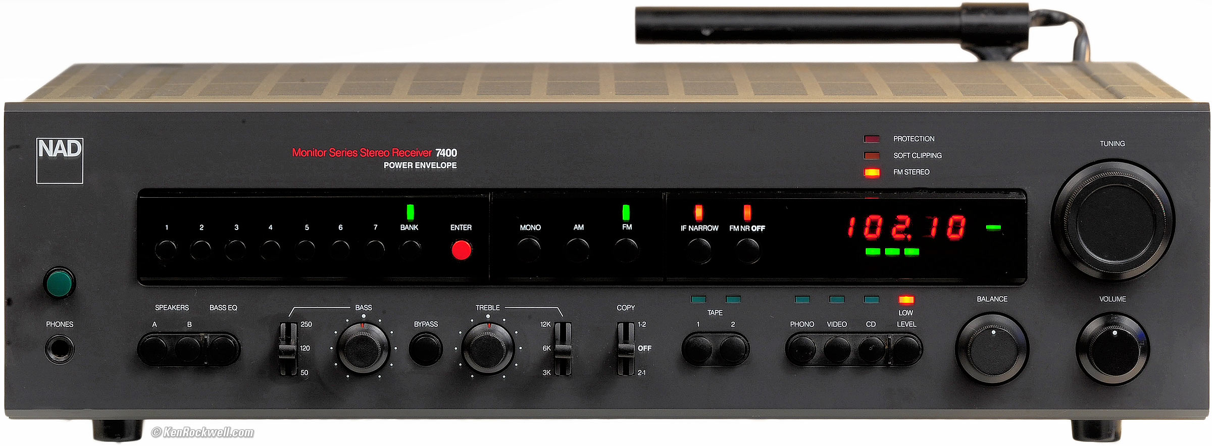 Recommendations top Intro Specifications Measurements Compared The NAD 7400 is a great receiver. Its best virtues are styling as good as ADS or B&O, great, simple controls, a great remote, and a very closely tracking volume control. This is a product that actually works much better than brands designed in the Orient with controls and remotes with so many buttons that no one can ever get the music to play. With this NAD, it looks great, and it's easy to get the music on and tune the radio. It was designed in Belgium. Since it separates into discrete power amplifier and preamplifier, you can integrate it into any sort of complex system. Technically, it sounds and tests very well. For about $250 used today (see How to Win at eBay), most samples are pretty worn out. Most samples I've seen get damaged in shipping, or have front-panel buttons that don't always work (sometimes you have to wait a moment and try again; the remote control always works even if the front panel doesn't), and others simply wouldn't pull-in the speaker relays and play music. If you get a good one, great, but sadly it will be difficult to get a good used one today.
