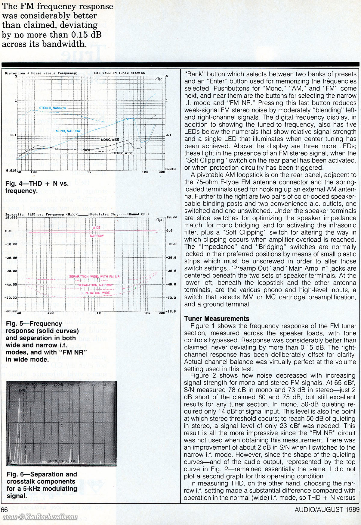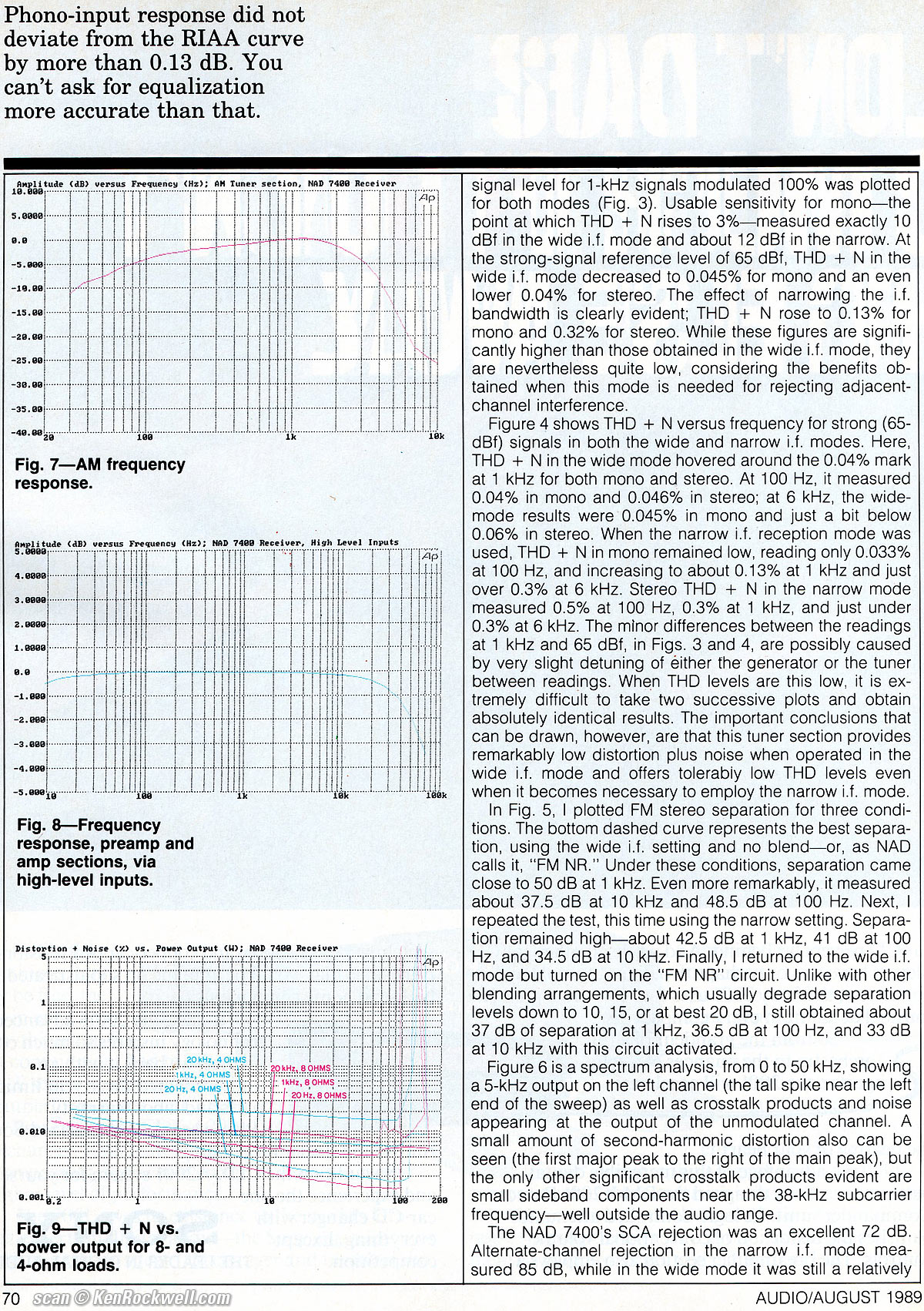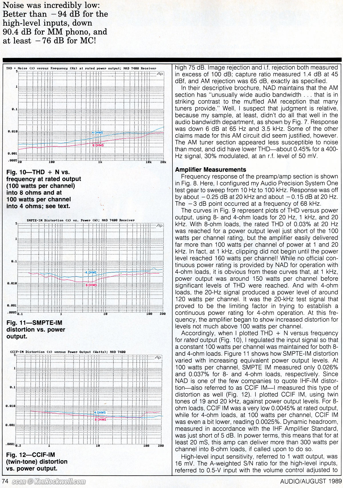 Recommendations top Intro Specifications Measurements Compared The NAD 7400 is a great receiver. Its best virtues are styling as good as ADS or B&O, great, simple controls, a great remote, and a very closely tracking volume control. This is a product that actually works much better than brands designed in the Orient with controls and remotes with so many buttons that no one can ever get the music to play. With this NAD, it looks great, and it's easy to get the music on and tune the radio. It was designed in Belgium. Since it separates into discrete power amplifier and preamplifier, you can integrate it into any sort of complex system. Technically, it sounds and tests very well. For about $250 used today (see How to Win at eBay), most samples are pretty worn out. Most samples I've seen get damaged in shipping, or have front-panel buttons that don't always work (sometimes you have to wait a moment and try again; the remote control always works even if the front panel doesn't), and others simply wouldn't pull-in the speaker relays and play music. If you get a good one, great, but sadly it will be difficult to get a good used one today.
