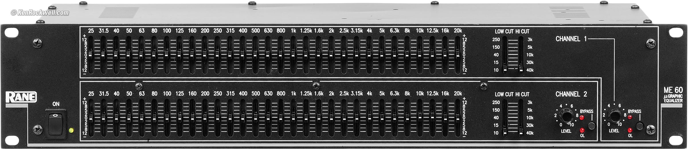 Rane ME 60. enlarge. Introduction top Intro Specs Measurements Recommendations More The Rane ME 60 is a compact 2 RU third-octave graphic equalizer. It is a pro balanced equalizer with XLR and TRS ¼" jacks, as well as unbalanced RCA jacks for home Hi-Fi use. (The newest ME 60S omits the RCA jacks.) It has a hard-wired overall bypass switch, meaning signal comes through even with the power off. It's missing the 20 Hz and 16 Hz sliders, but adds sweepable LO CUT and HI CUT filters, as well as individual input gain controls. This is a professional equalizer for concert sound, and it performs well for Hi-Fi use if you need to mount it in a rack. There is a power-off thump when used unbalanced. Its filters are called "Interpolating constant-Q filters," and what that means is that they are much narrower than most filters at small levels of boost or cut. In other words, most graphic equalizers are broader at small deviations from flat, while this equalizer stays narrowband. Depending on what you're trying to do, this may be better or worse. The filter shapes make this graphic equalizer is better than most if you want flat response with all the sliders boosted or cut. The resulting curves are flatter when all are boosted or cut, but they tend to be bumpier when you're moving only a few sliders a little bit, as is usually the case with graphic equalizers.