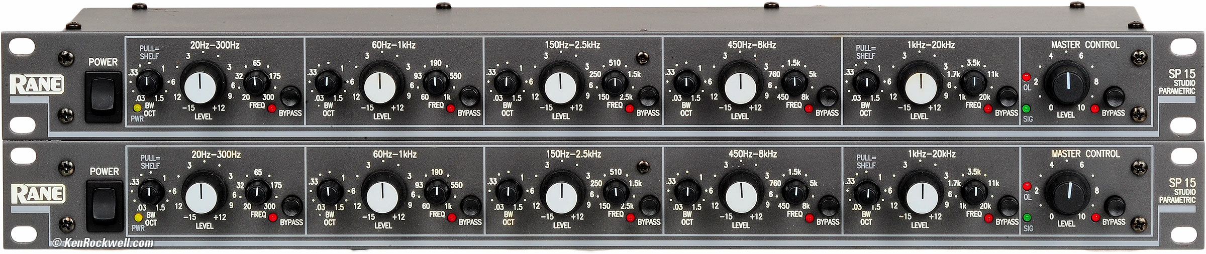 Right side, two Rane SP 15s. enlarge. Introduction top Intro Specs Sound Measurements Usage Recommendations More The Rane SP 15 is an unusually flexible 5-band parametric equalizer. It's a single-channel, 1 RU device. I show and measure two of them for stereo. It has five bands that cover ideal ranges, the top and bottom bands also work as shelving controls, and every knob is both very legible and very easy to adjust both quickly and precisely. The band gain pots all have perfect center detents, and each band also has an individual bypass button. There is also a hard-wired overall bypass switch, meaning signal comes through even with the power off.
