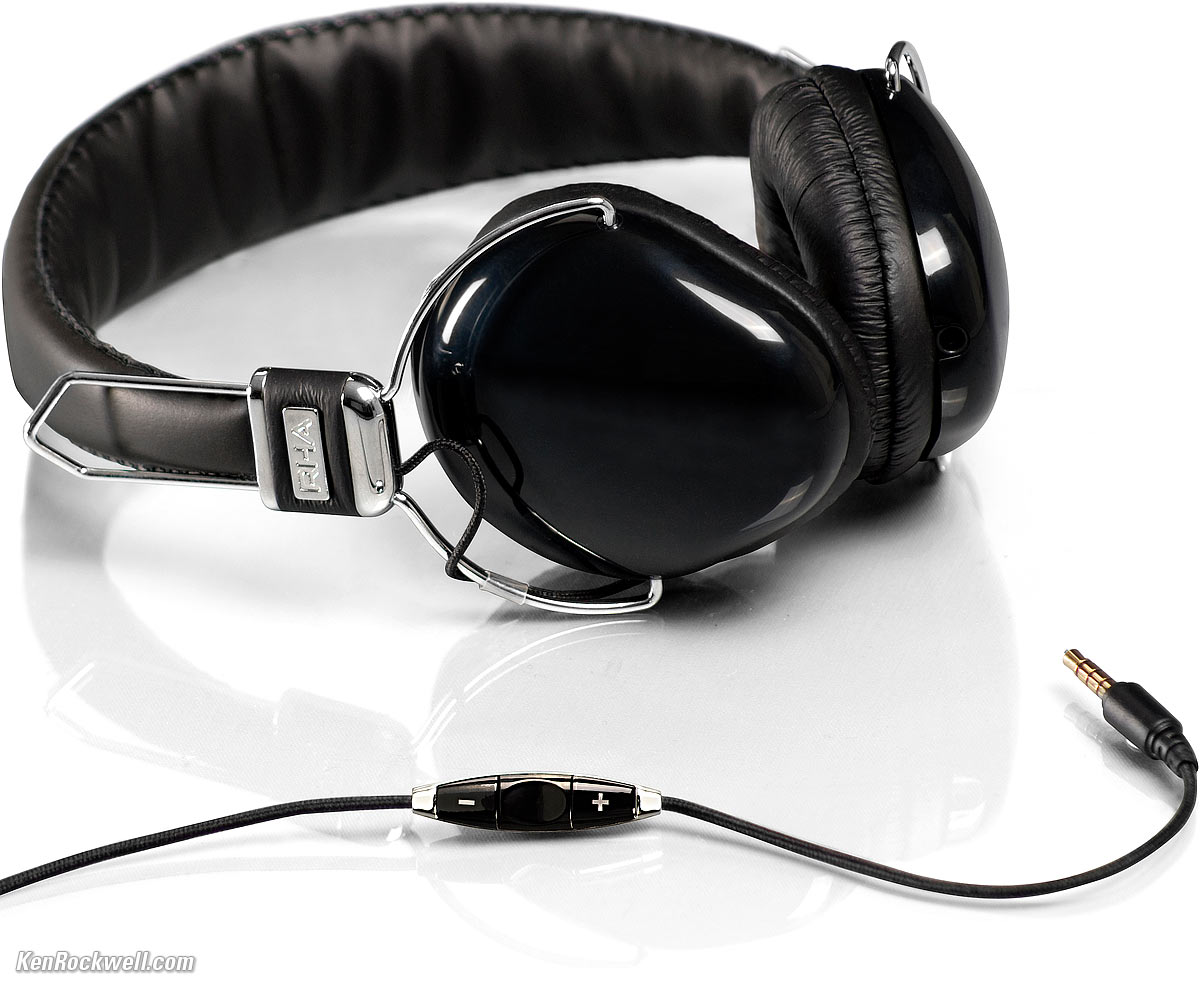 Introduction top Intro Specs Performance Compared Recommendations More These inexpensive RHA SA950i headphones are ultra lightweight over-the-ear closed-back isolating headphones with much better sound than I was expecting. The don't fold, but they do have an on-cord iPhone, iPod and iPad remote and mic. They are much lighter than any other isolating headphone I've used. These are so good for most use in the field that my wife stole them from me and I can't get them back. All the other headphones I offered her for use with her iPad were too heavy or too ugly for her. The cord is flyweight, too. It's a thin cloth-covered cord that feels like a thin shoelace. The connectors are almost as tiny as Apple's. This is important because most headphones have connectors so big that when you drop your device, you break-off the plug and damage your iPad's innards. The SA950i weigh nothing, but have a warm solid sound with great bass. Overall response is tilted in favour of the low end. Favoured? RHA is based in Glasgow, Scotland. Its funny that RHA pitches themselves as from the "UK;" heck, Glasgow is where Linn is based, and Linn is one of the last remaining great Hi-Fi companies left in the industry. (Don't get too excited; these are made in China.) If I were RHA, I'd be pitching bonnie Scotland over the generic "UK." These RHA headphones have far more solid bass than I'd ever expect from such delicate lightweight headphones. In fact, don't tell Velodyne, but I prefer the bass and the overall clarity of these $60 RHA headphones to the sound from Velodyne's $399 vTrue! These RHA are much cleaner sounding, and yes, have better bass, too, than the huge vTrue. The professional-standards Audio-Technica ATH-M50 ($120) and Sony MDR-V6 ($72) each have more neutral sound and are much more durable, but they are also much heavier. My wife, a normal person, wanted nothing of them. What's neutral for professional use is quite different than the warmer sound of these RHAs, which many people will prefer for enjoying music, as opposed to recording where you want to hear everything that's wrong with your sound while you can still do something about it. The sound from these tiny RHAs will vary greatly with how you put them over your ears. You'll lose deep bass if they're not square on top of your ears, and if they are further forward of back, you'll lose the highs since they'll miss going directly into your ear canal. Because we all have differently shaped-ears, the same headphones will sound vastly different to each of us. My biggest concern for these travel-ready headphones is that they don't fold flat to sit on top of my iPad in my backpack, as do the Focal Spirit One and ATH-M50. The shiny black plastic will scratch, and the wonderfully thin cord is easy to knot — but so what, my wife won't give these back. The SA950i box is pretty flashy. It has a magnetically-latched cover, and when opened, shows the headphones through a plastic window. This was great for the days of the old "retail" stores, but since we all buy online today, I'd rather that that money was put into something we could use — or give us a lower price — in a plain white box.