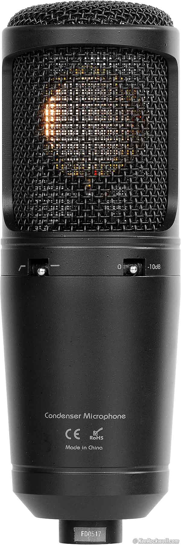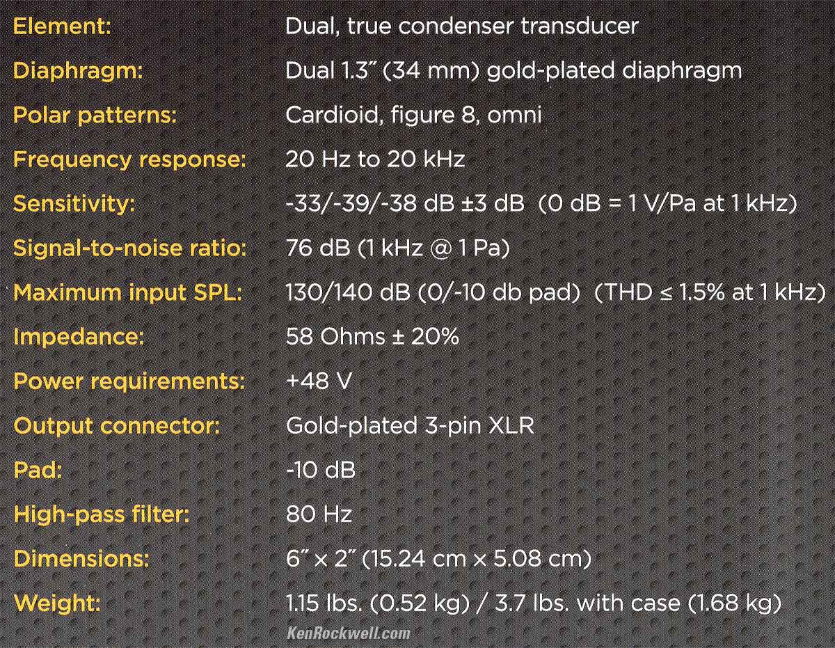 Format, Connections & InterfacesTop Intro Format, Connections & Interfaces Specifications Accessories Unboxing Performance, Usage & Recommendations I got my two SCM-660s (for stereo) at B&H. This is an analog 48V phantom-powered microphone with a low-level balanced low-impedance output via a three-pin gold XLR connector on the bottom for use with an XLR mic cable (not included), mixing consoles and/or outboard mic preamps or pro XLR mic inputs on video gear. To use it digitally, you'll need your choice of USB audio interface. I use the state-of-the-art Apogee Duet (see my review of my older model Apogee Duet 2), and the less expensive interfaces work great as well. To connect to an older iPhone's 3.5mm audio jack for mono-only input, use an analog preamp (the ART USB Dual Pre works fine), a 3.5mm male-to-male cable and a 3.5mm standard mic to Apple 3.5mm adapter so the phone recognizes the external mic. To use it with a modern Apple lighting connector, use the same analog preamp (the ART USB Dual Pre works fine), a 3.5mm male-to-male cable and a 3.5mm standard mic to Apple 3.5mm adapter, and also use Apple's 3.5mm lighting adapter — or just use the Apogee Duet, which also works with the lighting interface. I use the Duet just because I can, but Apogee is pro-level studio gear that costs more than this microphone. Using the mic at about 12" from my mouth with the ART USB Dual Pre, I set the mic preamp gain to 30dB, the headphone output to entirely preamp and the headphone level to 10:30 o'clock and use a dual male 3.5mm cable to connect the preamp's headphone jack to the 3.5mm input of the contraptions above. From 5" (13cm) away I set the preamp's headphone output to about 10 o'clock. You should use the dedicated 1/4" line outputs from that preamp, but I was too lazy to find the correct 1/4" to 3.5mm cable.
