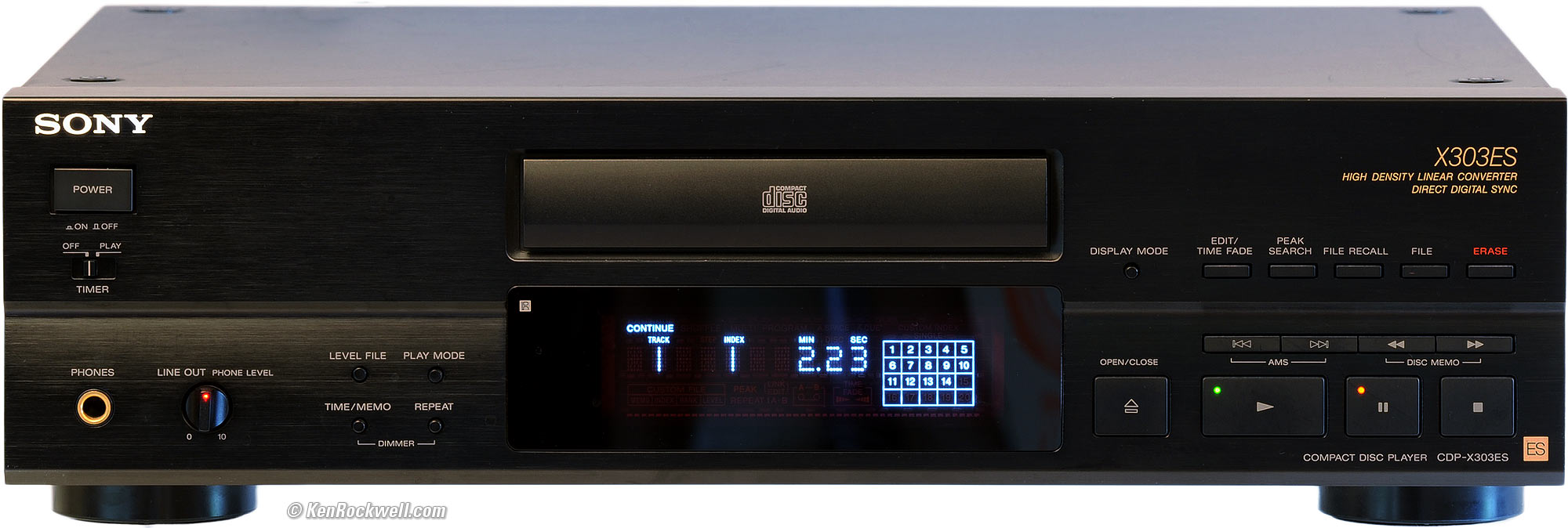 Compared top Intro Specs Performance Measurements Usage Compared Recommendations The CDP-X303ES was Sony's second most expensive CD player with a catalog price of $1,200 in today's dollars ($730 at the time ignoring inflation). The only more expensive Sony player at the time was the CDP-X707ES, which packaged the X303ES guts in gold trim with balanced outputs and some weights inside to impress the innocent. The X707ES stickered at $3,300 in today's dollars ($2,000 at the time, catalog price) to take rich suckers for a ride. There was also an X505ES seen outside the USA, which again was the 303ES with some extra trim. The less expensive X202 is also very good for less money. I prefer a good CD player like this to an external DAC. For instance, this 20-year-old CD player measured today still has better frequency response, better overload handling and less noise and more dynamic range than a new Benchmark DAC1 HDR!