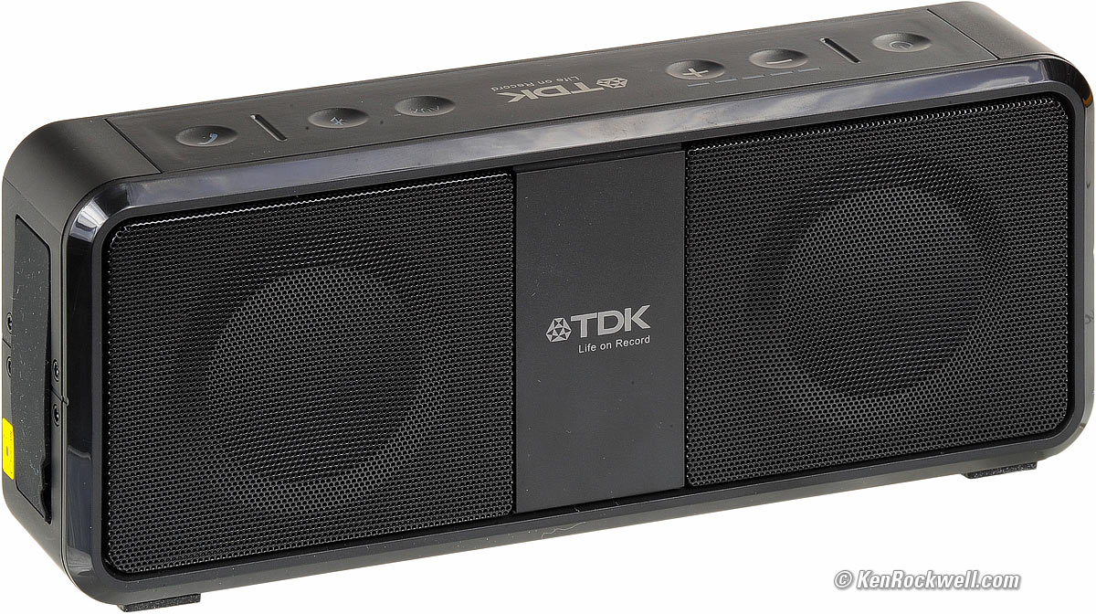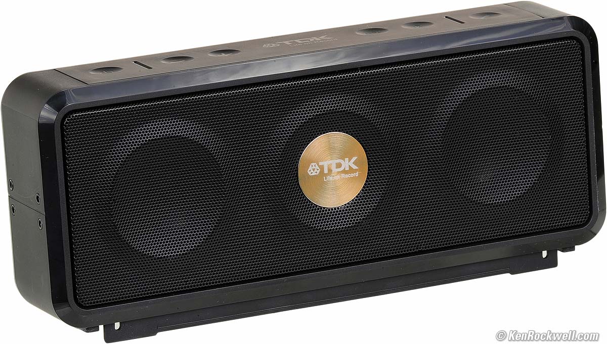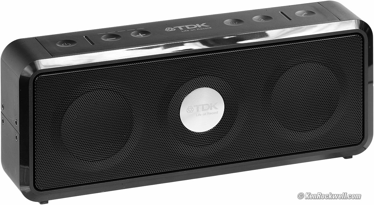 The TDK A33 is the world's best Bluetooth speaker because it sounds at least as good as the $300 Bluetooth speakers I've heard, it runs on AC power as well as its own included rechargeable battery, it's splash-resistant for use by your pool, it has a built-in mic for use as a speakerphone, it's super easy to use, and it's Bluetooth connection is the best ever. The TDK A33 is so smart that even after being turned off for months, just turn it on and it will reconnect all by itself and start your music playing without you having to make so much as one click. That's what music's all about! The A33 is also the perfect size: small enough to go with you everywhere, and big enough to fill a large room with big sound at least as well as Bose. This little thing sounds great, and is perfect for portable music from my iPhone, movie sound from my iPad, or even desktop sound from my Mac. I bought one of these for myself when I saw it recommend in Consumer Reports' list of the 10 top electronic products of 2013. Out of the thousands of products tested by Consumer Reports, they chose just ten as the year's standouts. Along with TVs, phones and cameras was this TDK speaker, rated as one of the best they've tested, and it's priced at a fraction of those from more heavily advertised brands. For just $150 I couldn't resist, and boy, were they were right! For $100 or less today, the A33 is an absolute no-brainer for you and everyone on your Christmas list. It made Consumer Report's best-of again, on page 29 of the December 2014 issue. This little A33 speaker sounds as good or better than any of the Bose or other bluetooth speakers I've heard, and costs nearly nothing. It's the steal of the year! It sounds warm and smooth, just like a tube console radio or phonograph. Honest, I first played Christmas music on it, and it sounded just like the radio/phonograph at my mom's house with a 12" speaker and a 10 watt vacuum tube amplifier built by my dad back when he was a kid! This speaker is all about clean, smooth and mellifluous sound. It's accurate; nothing is boosted to sell well at a retail store. If you want more bass, put it against a wall or in a corner, and for less bass, put it on a table away from any walls. This TDK uses all the same tricks as Bose: loads of active bass equalization, efficient class-D amplification and tough little drivers and passive radiators in a tough, tight box. It's also got a microphone so you can use it as a speaker phone to receive calls. It connects via Bluetooth in seconds, and immediately starts playing. Playing from my iPhone 5, it plays for hours without skips so long as I stay within about 40 feet (12 meters). It's far better than Apple's AirPlay, which always cuts out for me. Connected to my iPod, iPhone or iPad, it's all good! There is also a 3.5mm AUX input so you can play your TDK cassettes or play your 1/2" masters from your Studer A80 with the right adapters. TDK rates the maximum input of the 3.5mm jack as 2.5V RMS, meaning it's perfect for use with any CD player or other portable device. It runs about 6 hours on its internal Ni-MH battery. It also runs and charges from AC power with the included 12 V DC adapter. There is a 1A USB outlet for charging other devices, so long as you're also plugged into charging power. TDK says use only their AC adapter, but I'll bet you any standard 12V center-positve AC adapter or car-battery cord works just fine, too. There is a slide switch to disconnect the battery from discharging, and it will charge regardless of the setting of the slide switch. The only reason to use the slide switch to turn it off is to prevent it from turning on or discharging accidentally. No worries about turning off the power: just walk away, and it turns itself off after about 20 minutes idle. My only whine is that it beeps if it loses your bluetooth signal. It has a hissy fit, like leaving the cassette door open on a 1990s Mercedes. If you have anyone else in the room as you leave, you'll have to turn it off otherwise it will drive them crazy. The beeping is actually the "Hey, let's connect Bluetooth, dummy" alert, which is useful as you're setting up the first time, but unacceptable later. If you leave the area, it restarts your music as soon as you get back within range. If it turned off, hit the power button to turn it back on, and it fires your music back up all by itself. Brilliant! It's splash resistant. Everything is rubberized. Don't dunk it, but if it get splashed at the pool, no worries. Just as if it ran on tubes, the top gets a little warm as it plays. It's sturdy plastic, with metal grilles and sturdy rubber feet so it doesn't walk away while playing. If you touch it, you'll feel this little speaker vibrating like crazy cranking out big bass from a tiny box, just like the Bose speakers for double or triple the price. Someone has to pay for those fancy stores! The volume setting is shown by a 5-segment LED bar graph, but it's more precise than that because the top LED on the bar varies its brightness as you set intermittent levels. I find that volume is slow to adjust on the speaker, but no big deal since we usually adjust the volume from our Bluetooth device. The volume LEDs are behind the buttons, so they tend to hide as you're adjusting the volume. Ditto for the Bluetooth light; it's in the button so you can't see if it's blinking or not as you press the button. It uses powerful magnets to get all this sound out of such a tiny box — keep it away from your cassettes or CRTs. Measured at the outside of the speaker, I measure 5,000 µT (50 Gauss) maximum, 1,300 µT (13 Gauss) typical. This is about the same or more than a giant subwoofer like the 100-pound, 1 kilowatt, 15" B&W ASW 850 subwoofer, and is because with the A33 we can get so much closer to the magnets than we can with bigger speakers in bigger boxes. It easily fills a big room with big sound, but as you'd expect from this single speaker, it's in mono. To hear stereo, your head n