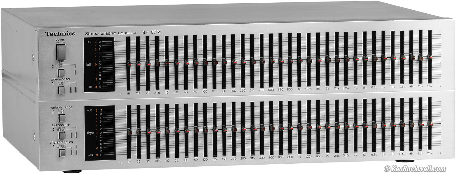 Recommendations top Intro Specs Performance Usage Recommendations The Technics SH-8065 33-band equalizer is particularly well suited for precision equalization of top-end home systems, especially because of its extended frequency range, and second precise ±3 dB adjustment range. This equalizer is for people needing to make exacting and precise adjustments, both by ear and with instruments. The SH-8065 is relevant today, as there is nothing else like it for serous home use. For instance, one could pay less for a new professional dbx 231 dual 31-band EQ, however it lacks the 16 Hz adjustment, which I find important, and lacks RCA connections. More important, the dbx' sliders are too tiny. Even though the dbx 231 offers a ±6 dB range, since its sliders are less than half as long (20mm in the dbx versus 45mm in the Technics SH-8065), the adjustments are still more easy and precise in the Technics' ±12 dB range! I also doubt that any professional EQ would have its signal levels optimized for audiophile use, especially seeing how the Technics offers two choices of system level optimization for audiophile systems. For general use as a tone control, an ordinary 10-band octave equalizer is much more convenient, because one will be moving a lot of sliders at the same time on this SH-8065 third-octave equalizer. If you've found my work here helpful, this free website's biggest source of support is when you use these links, especially this link to them at eBay, where they sell for about $250 (see How to Win at eBay). If there are none there, here's the link to all Technics equalizers at eBay. t helps me keep reviewing these oldies when you get yours through these links, thanks! Ken.