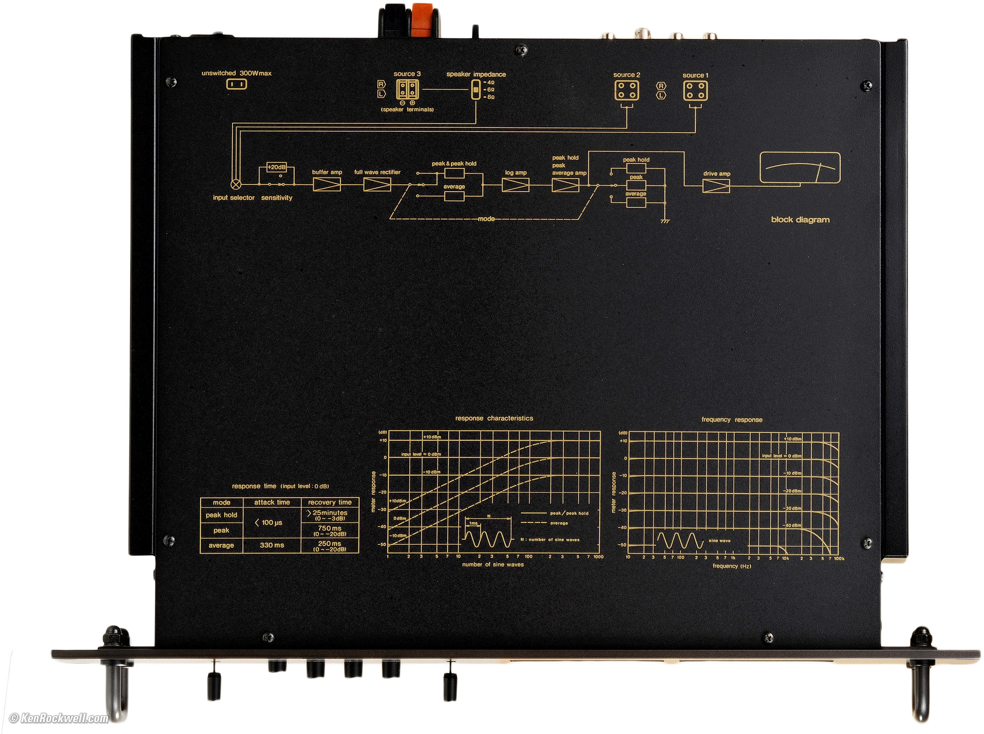 Circuit Design It uses a full-wave rectifier. It either has an instantaneous peak attack, or a 200 mS attack in average mode. Decay is either roughly VU, or infinite. The front panel selects either of two loop-through line-level RCA inputs, or the back-panel speaker level (power) inputs. Watts are measured as voltage, then displayed as power into your choice of 8Ω, 6Ω or 4Ω. The +20 dB range switch is on front, and the 8Ω, 6Ω or 4Ω selection switch is on the back. The SH-9020 is calibrated in dBu (0 dBu = 774.6 mV) for line levels, but it's not marked that way. A standard CD player or DAC has a 2 V maximum output, and will read +8.2 dBu peak. Peak and Aveerage levels are calibrated for the RMS value of a sine wave; in other words, a sine wave will read the same in either the Peak or Average settings.