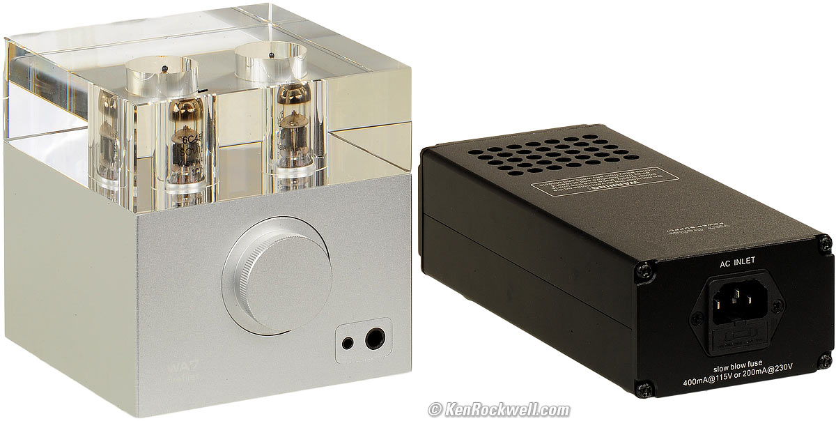 Woo WA7 Fireflies and included custom power supply (no cords shown). bigger. The Woo Audio WA7 is the real thing, loaded with tons of gain and output power, a big, precise and smooth volume control that allows easy, instant adjustment over a huge range of volumes with no channel imbalance, and no noise, no oscillation, no funny business and no problems — just loads of beautiful, clean music from a perfectly constructed instrument. Woo amplifiers are built as they should be: hand-made and all-metal, especially the knobs and switches. All the markings are engraved, not printed. At any price, the Woo amplifiers are precision works of art. The glass safety cover sits on top, held on by gravity. It's made of solid glass; one big, clear chunk with two holes for the tubes. The WA7 is a thing of museum-grade beauty and simplicity. There are no screws visible from any direction when it's sitting on a table, and all the switches are on the back. How can something this extraordinary be such a bargain? Easy: Woo usually sells direct, so you're paying direct. With no expensive middle-men, distributors and dealers expecting 40% margins at every step, you're getting today what would sell for many times more if it were more widely distributed. If Woo hired a copywriter to spin more audiophile BS and PR about them, he could be asking — and getting — ten times the price. It's that good, especially compared to the many poorly designed and cheaply made pieces out there selling for more. This Woo amp operates without any noise or instability or oscillation at any level. It just works as it should, with none of the funny business all too common today in what passes for audiophile gear. The only way you'll appreciate how precisely, solidly and carefully made are these amplifiers is to own one. Everything looks the same online, which is why I've gone on about how wonderful it is to see some real gear made without compromise — and when this equipment sells for bargain prices because it's still a relatively less-known brand and sold directly, I'm all over it. My review unit has the standard tubes, and sounds great. I didn't go for any of the upgrades.