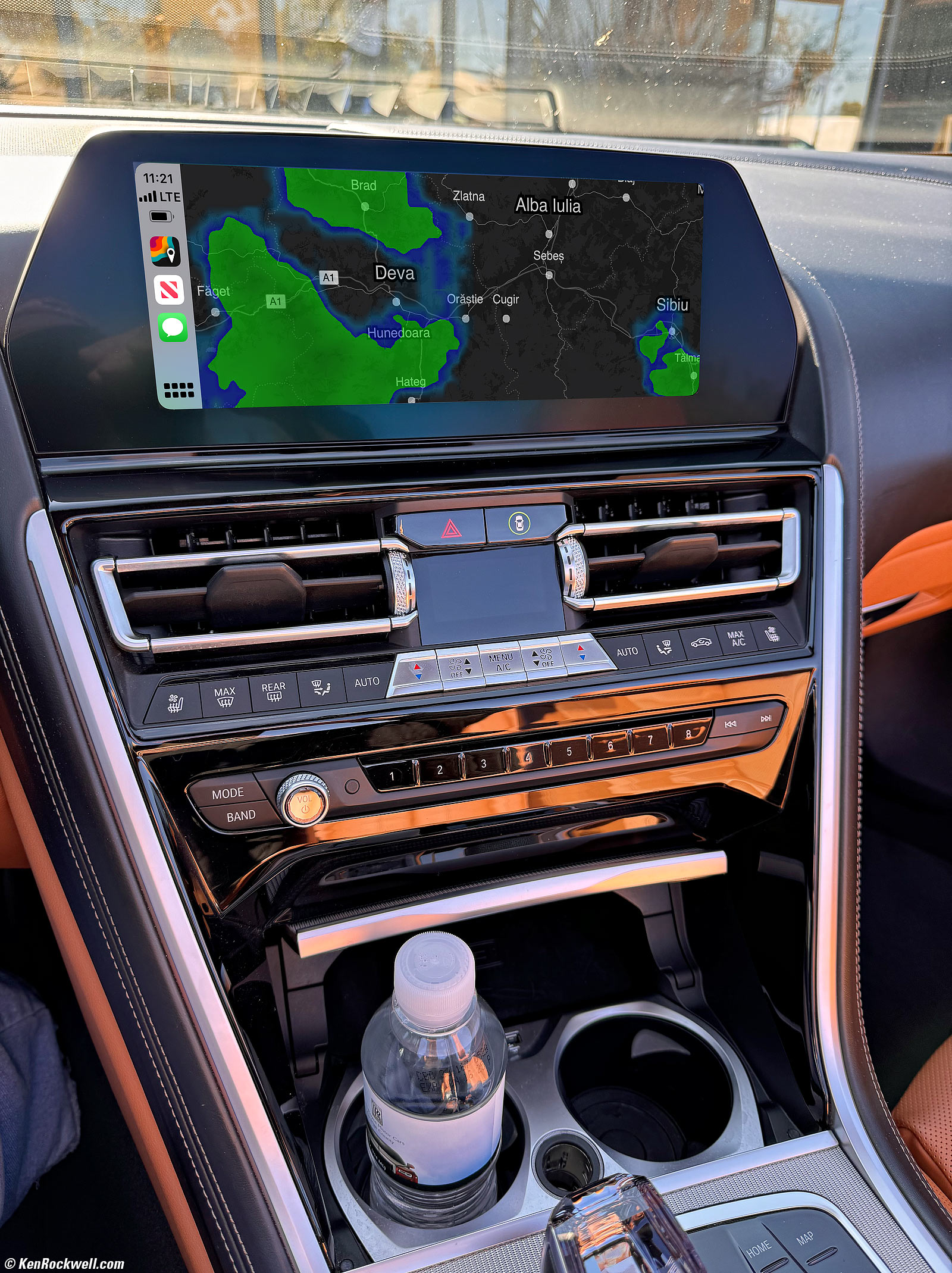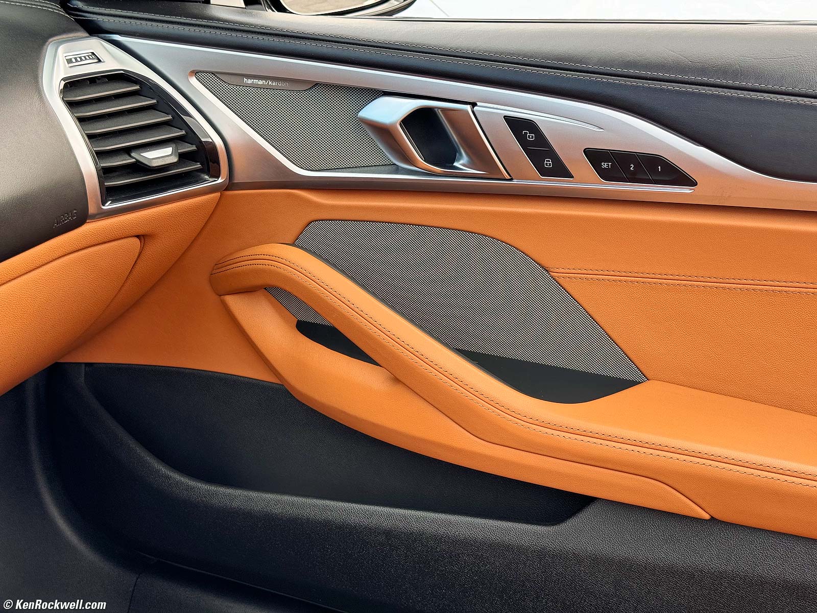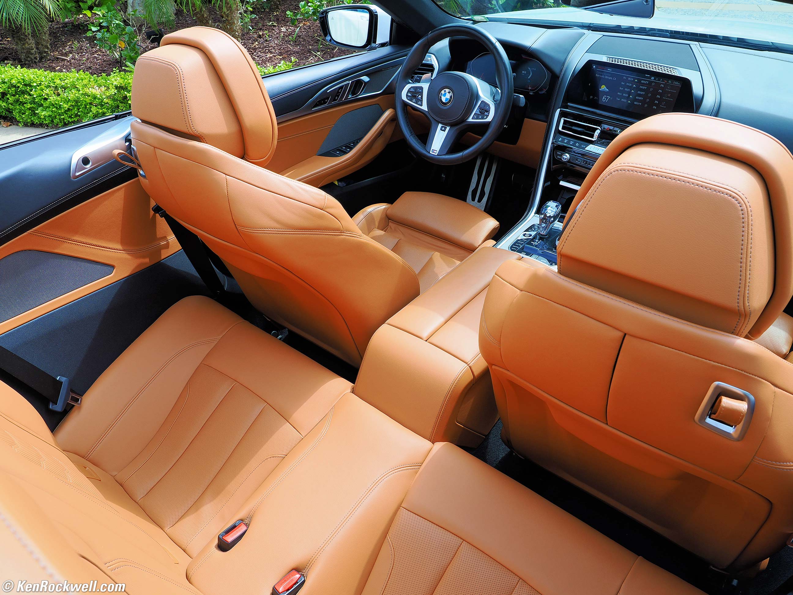 BMW /// M850i xDrive Convertible Interior in Rich Corinthian Cognac Merino Leather, 10:54 AM, Friday, 26 May 2023. Shot with Canon EOS R50 with +4 Saturation, Canon RF 18-45mm IS STM at 18mm at f/8 at 1/25 hand held at Auto ISO 100 (LV 10.6), exactly as shot. bigger or camera-original 24 MP © JPG file (about 5 MB). I have the saturation cranked up so it also exaggerates the orange.