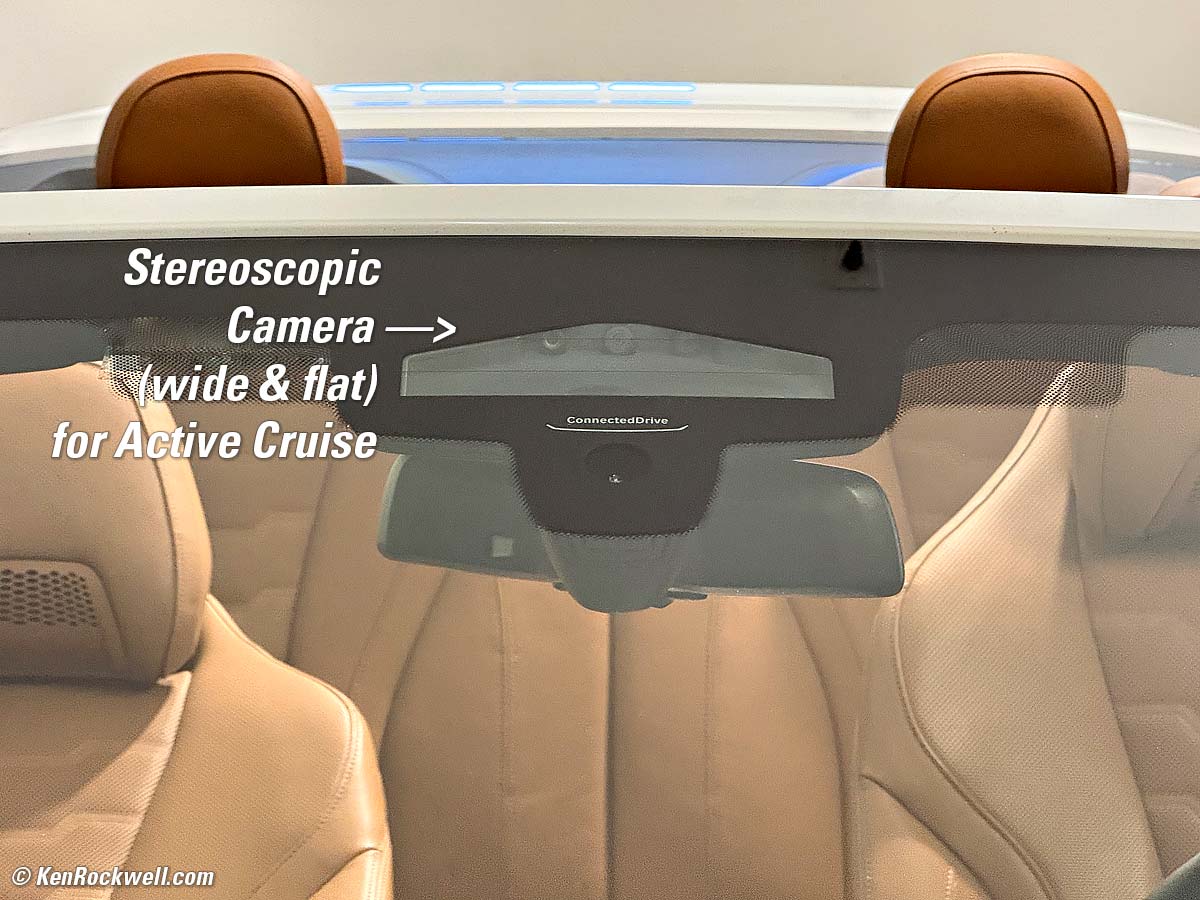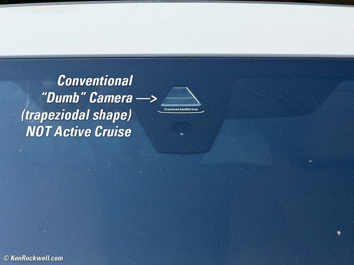 Do You Have Active (Adaptive) Cruise Control?The window sticker will show option ZDY, 5AU Active Driving Assistant Pro. It also may show 5AR Extended Traffic Jam Assistant, which adds Level-2 self driving in freeway traffic below 40 MPH. Both of these systems will maintain a safe, adjustable distance behind other traffic if it's slower than your set cruise speed. Additionally, with the 5AR Extended Traffic Jam Assistant (Level-2 self driving) option, it will steer and start and stop with the traffic for as long as a traffic jam continues. It's very smart and polite, and mine expertly lets others change lanes in front of me with no problems if traffic merges. Bravo! Both of these options will have a RADAR antenna in the center of the lower grille, and more subtly a 3-D stereoscopic camera system just above the rearview mirror: Active Cruise RADAR Antenna & Stereoscopic Camera System. bigger. The stereoscopic camera system is a horizontal array of three tiny cameras which can see depth using AI just like our own minds. The more basic M8 below lacks Active Cruise Control. It has only one simple camera peeking out through a smaller trapezoidal window, and of course no RADAR antenna: A BMW M8 Without Active Cruise: NO Radar Antenna and NO 3D AI Camera System. bigger.