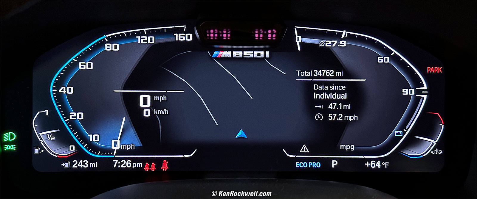 Acceleration3.4s 0-60 MPH on the track with the engine already revved in Launch Control and Sport+ mode, measured with a real-time optical tracker. These are how the numbers you see in ads and magazines are measured. 5.09s 0-60 MPH as measured slightly uphill in the real world at a traffic signal from idle dead-stopped in Comfort mode as read from the 850's own somewhat delayed-readout digital speedometer, and corrected for BMW's over-estimating speedometer which reads about 1.5 MPH high at 60 MPH. I stopped my timer when my speedometer read 62 MPH. Seeing how the digital speedometer reads with about a one second delay, this matches the magazine tests and shows we don't need to drive like idiots in Launch mode to get up and go. 8.3s 0-100 MPH, magazine tested. 11.8s @ 119 MPH standing ¼ mile, magazine tested. 20.9s 0-150 MPH, magazine tested.