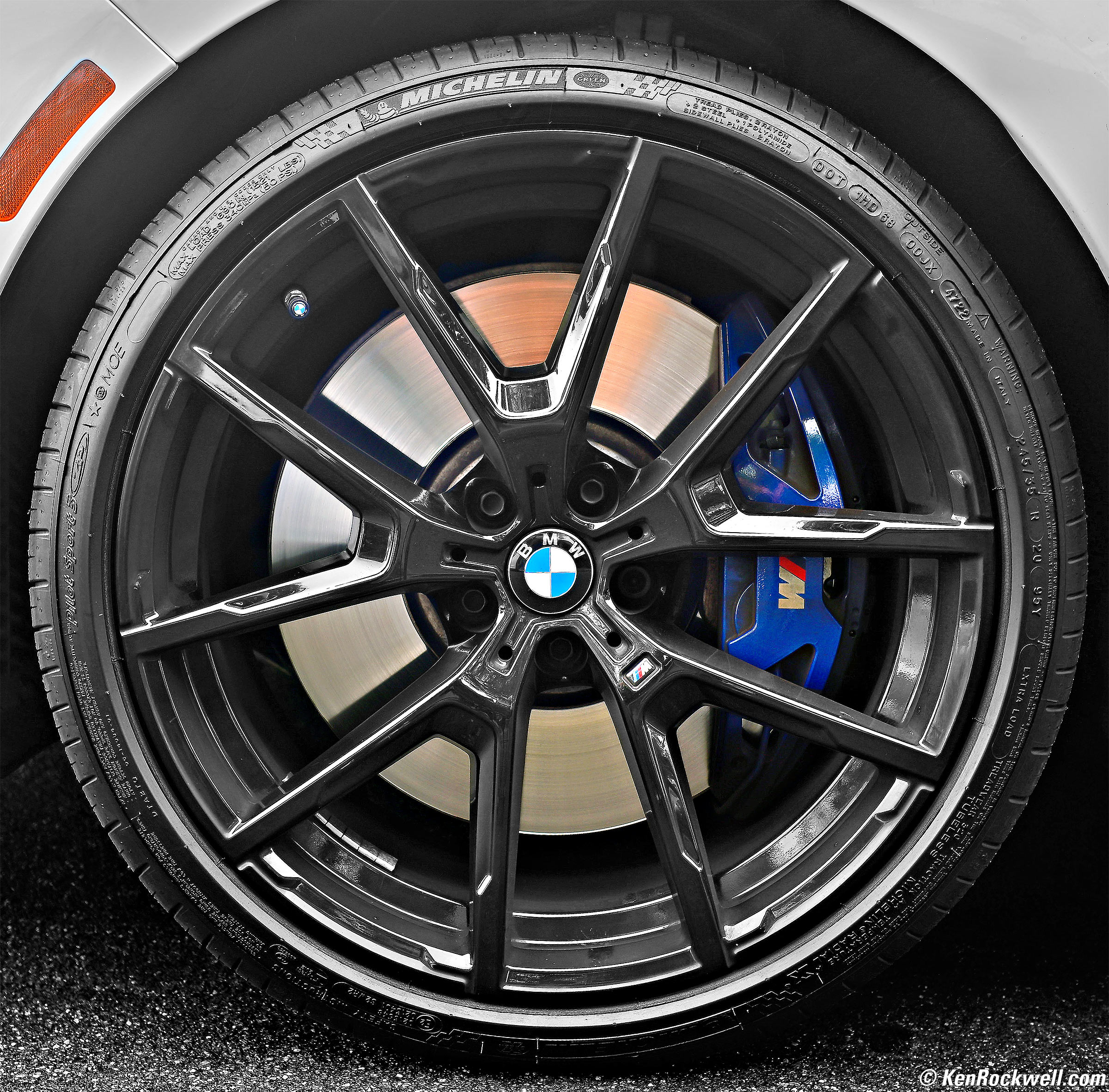 FrontFront Left TIre & Wheel, BMW M850i xDrive Convertible, 9:36 AM, Saturday, 07 July 2025. Nikon Z5 II, Viltrox AF 28mm f/4.5 at its fixed f/4.5 at 1/60 at Auto ISO 100 (LV 10⅓), Radiant Photo software to add detail in the dark. bigger or see the overall picture. 8J x 20 wheel. 245/35R20 95Y XL MICHELIN Pilot Sport 3 ★ MOE ZP BSW 320 / AA / A. 9/32" tread depth. 1,499 lbs at 50 PSI max. 10.0" wide overall on 8.5" rim; 8.1" tread width. 777 revs/mile, 26.8" diameter. Weighs 27.1 lbs. OE made in Italy. MSPN 87416.