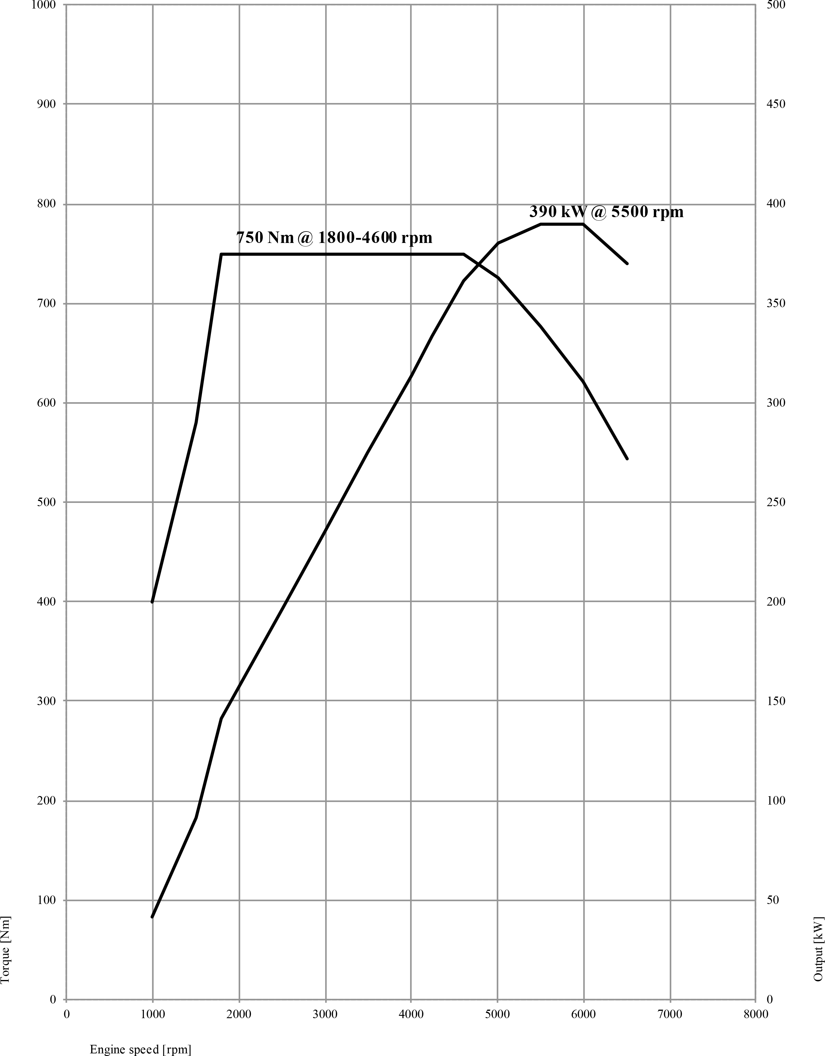 Engine (Power Unit)Quad-cam, 32 valve direct-injected V8 with twin gas-operated intercooled turbochargers, VALVETRONIC variable valve timing and double VANOS variable camshaft timing. 523 hp from 5,500 to 6,000 RPM USA (530 hp (390 kW) EU). 553 lb-ft (750 Nm) from 1,800 to 4,600 RPM. The curves below imply a 6,500 RPM redline, and that's where the M850i shifts at full throttle, although my dashboard tachometer redline starts at 6,000 RPM. The small, unnumbered bargraph tachometer in the HUD seems to be yellow from 6,000 RPM to 6,500 RPM. 268 CID (4,395 cc). Aluminum block & heads. Maximum turbo boost (indicated): 1.25 bar (18 PSI), which makes 4.4 litres (268 CID) perform like 9.9 litres (604 CID) since 1.25 bar of boost is 2.25 times atmospheric pressure, or 67.4" (1,711 mm) Hg manifold absolute pressure. 17 / 20 / 26 MPG EPA. M850i Power Curves. bigger.