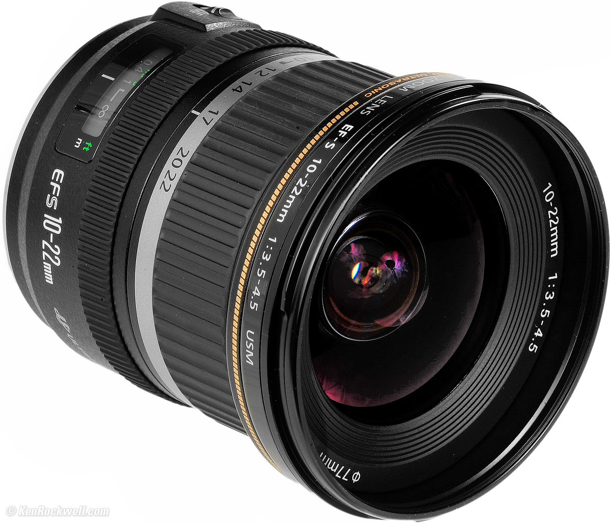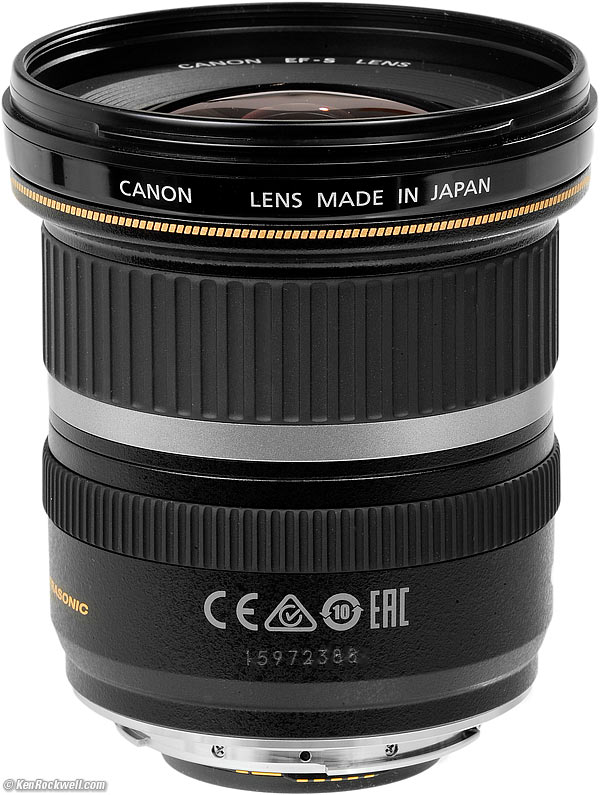 Canon EF-S 10-22mm USMAPS-C DSLRs only (2004-)NEWER, BETTER and LESS EXPENSIVE: Canon 10-18mm IS STMBest for Mirrorless Cameras: RF-S 10-18mm IS STM.Introduction Specs Performance Compared Usage Recommendations Canon EF-S 10-22mm USM (APS-C DSLR coverage only, 77mm filters, 13.5 oz./383 g, 9.5"/24cm close focus, about $550). bigger. I got mine at Adorama. I'd also get it at B&H or at Amazon, or used at eBay (How to Win at eBay). My biggest source of support is when you use any of these links, especially this link directly to it at Adorama or directly to it at Amazon, when you get anything, regardless of the country in which you live. It helps me keep adding to this free website when you get yours through those links — but I receive nothing for my efforts if you buy elsewhere. Thanks for your support! Ken.