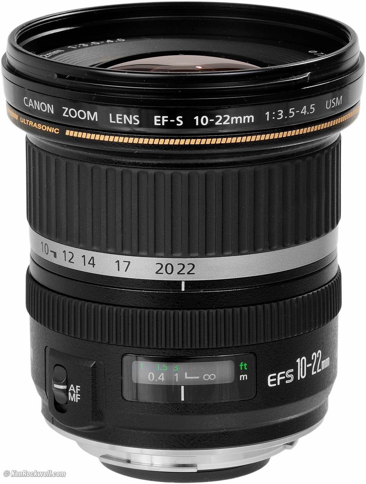 Ergonomics performance top Canon EF-S 10-22mm. Ergonomics are perfect. The front half of the lens is the zoom ring, and the focus and IS controls are right under your fingers. The zoom ring includes the gold ULTRASONIC band, which keeps your hand form slipping forward off the zoom ring. The thinner black ribbed ring at the rear is the manual focus ring. Flick it with a fingertip at any time for instant manual focus override.