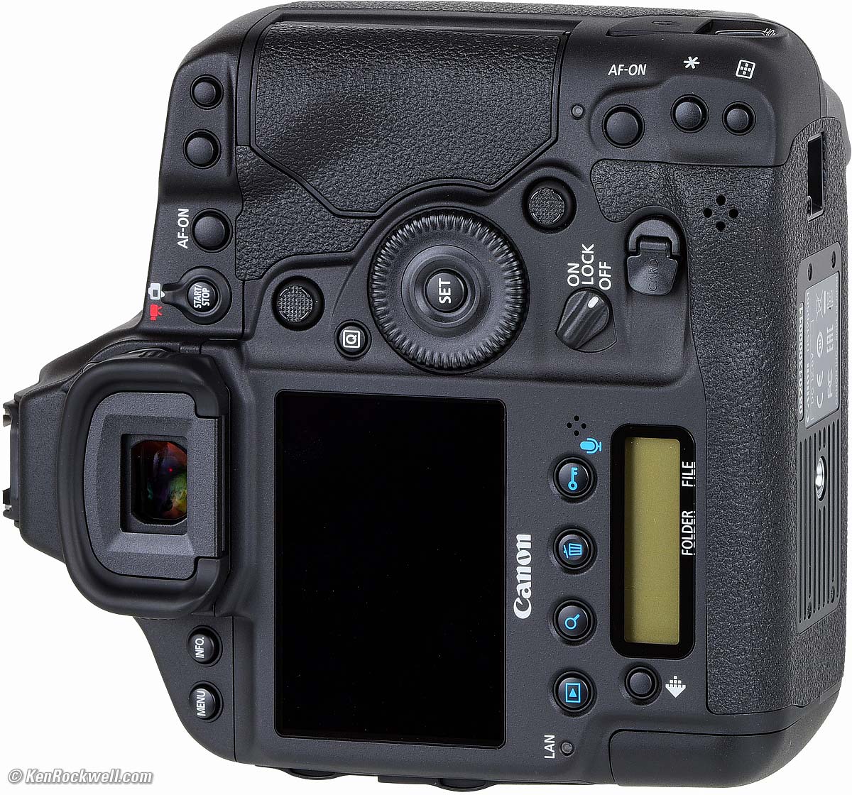 Rear LCD Data DisplayThe rear data LCD shows memory card status, image size(s) and file and folder numbers. The numbers are legible, while the cards and image sizes are less so. I prefer to set image sizes on the picture monitor, and to each their own. It has a blood-orange LED backlight if you need it. It goes completely blank when the 1DX2 is asleep, making it of limited value.