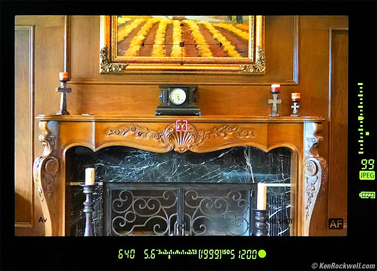 FinderThe finder is exceptionally sharp, bright and clear. The diopter adjustment is hidden behind the removable eyecup, so it doesn't get knocked out of adjustment like most cameras. Hallelujah! Actual view through Canon 1DX Mk II viewfinder. Note 2-axis level display at top. bigger. What looks better in person than in these photos is that the active AF areas light in red, and otherwise disappear when they're off. Unlike all Canon's less expensive cameras like the 5D series where the AF areas are black LCD boxes that block the subject, the 1DX Mk II simply lights clear red LEDs out of nowhere that don't block our view. This is especially impressive as you're shooting action and see the AF areas run all over to track your subject: See the finder, autofocus system and AF area displays tracking at 14 FPS (live video). There are many dark gray LCD mode indicators (AF locked, exposure mode, C1/2/3 mode, etc.) you can enable in the menus to show status along the bottom of the image display. These aren't that visible, but they don't block much of the image either. They don't light in the dark. There is a lever for an eyepiece blind. The blind appears gray when you've got it closed for use on a tripod with your eye away from the finder. This blind prevents light from coming in the back and fooling the meter into underexposure. The ground glass of the included focus screen is optimized for lenses of f/2.2 or slower. Faster lenses don't look any brighter or different than they do at f/2.2; this is typical for all SLRs since about 1987. Canon makes alternate screens, and for use with faster lenses they may have one that fits the 1DX2. I've never bothered with these.