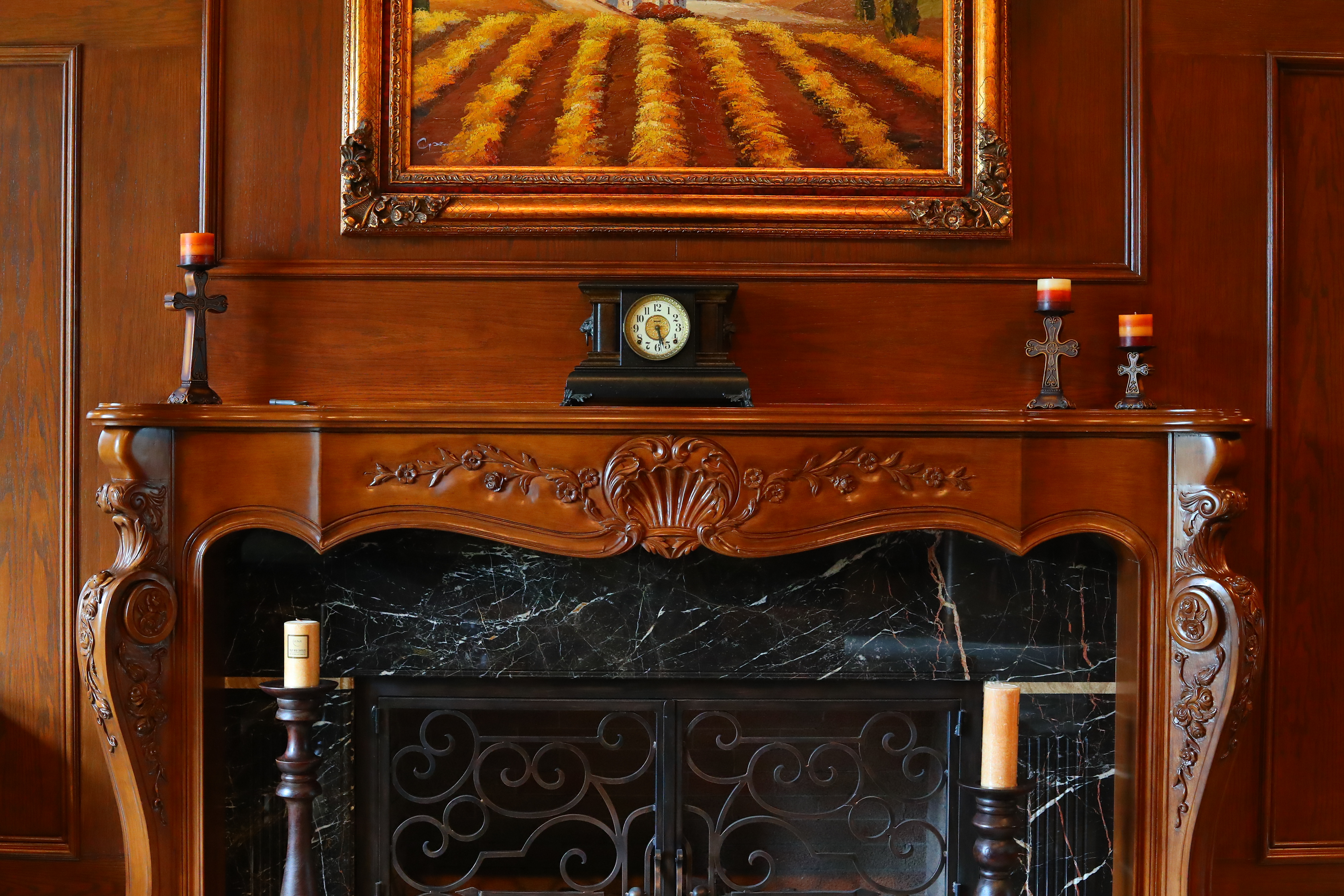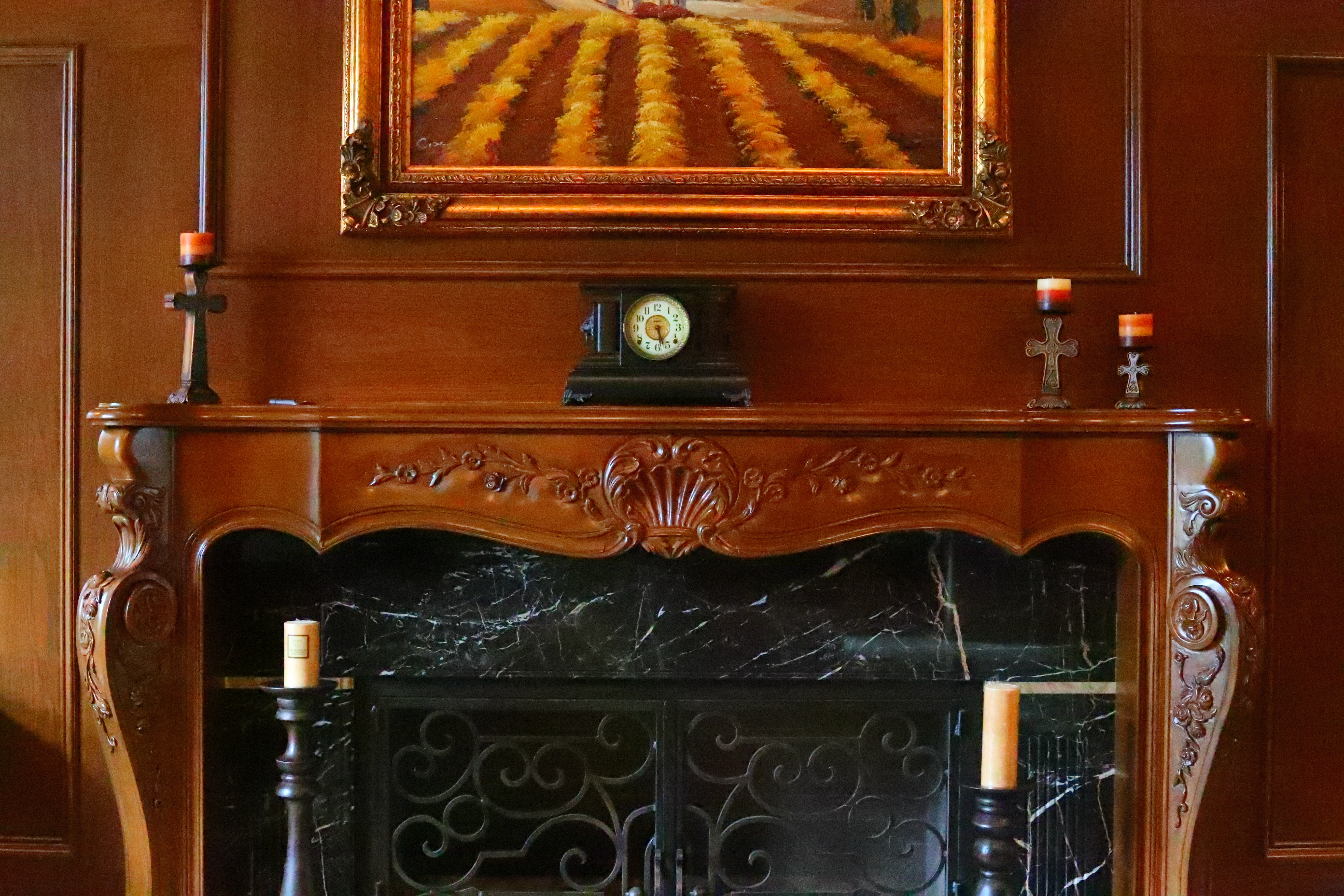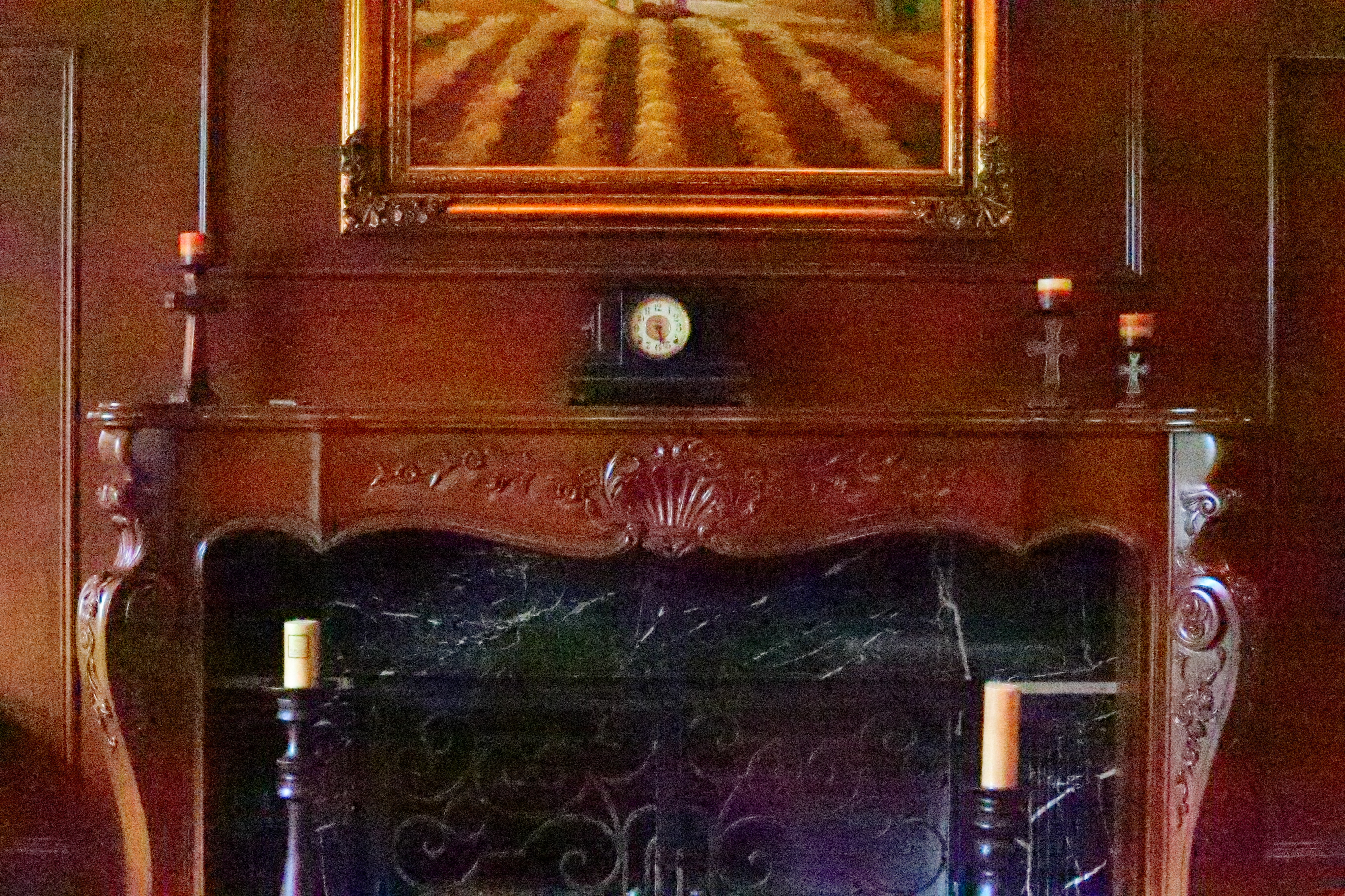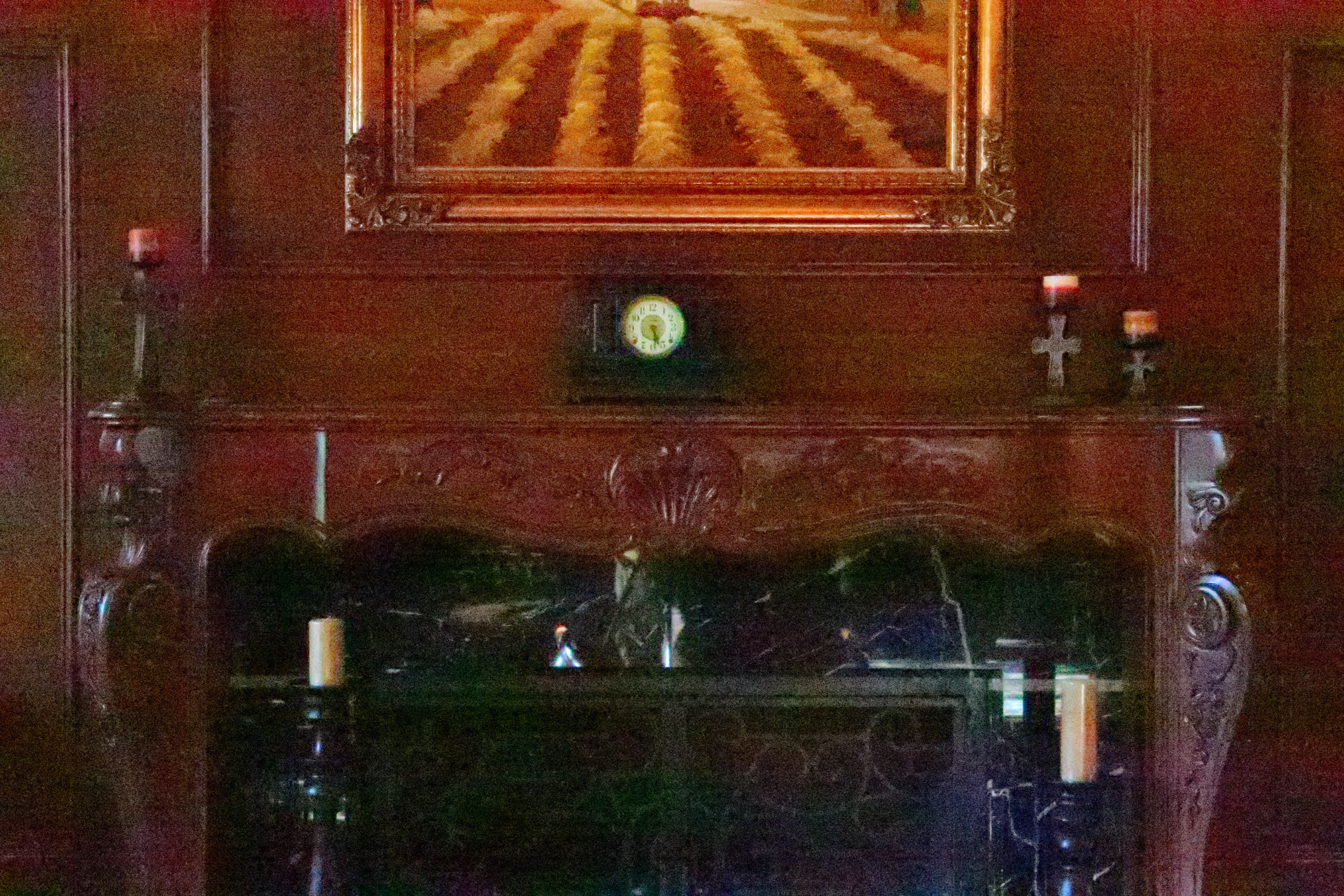Crops from above These are 600 x 450 pixel crops from the original images. They will vary in size to fit your browser window; if they are about 6" (15cm) wide on your screen, the complete image would print at 36 x 55" (1 x 1.5 meters) at this same high magnification. While images at high ISOs look great for reasonable sizes above, the differences are more obvious at the high magnification crops below. We lose details and subtle textures when seen at at high magnifications. As ISO climbs, we lose grain in the wood, the sparkles in the black wood grain, and everything gets softer. Fireplace bricks inside the grille disappear first on the left then the right, and the dust on grill vanishes. Click any for the same camera-original © files as above to explore on your computer (mobile devices rarely show the full resolution files properly). Obviously if you're printing mural size, avoid the highest pushed ISOs unless you want this smudged look, a byproduct of the camera's noise reduction, as a special effect.