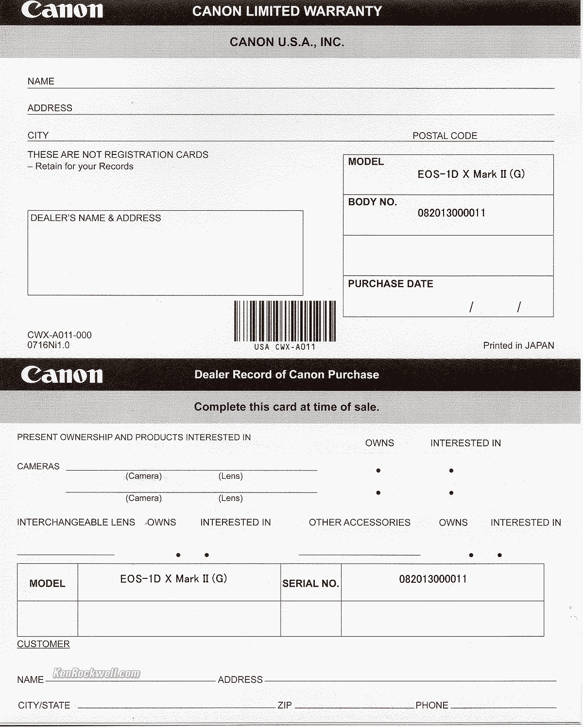 Getting a Legal USA Version (for USA only) Top Sample Images Intro Specifications Accessories USA Version Performance Compared Usage Recommendations More Today I'd get my 1DX II new at a deep discount at B&H or get it used at eBay (How to Win at eBay). USA versions include a white Canon USA warranty card marked "Canon U.S.A., INC." It lists the serial numbers of whatever's in the box: Canon USA Warranty Card, Canon 1DX Mk II. bigger. If yours has no USA card, you got ripped off with a gray market version from another country. This is why I never buy anyplace other than from my personally approved sources. You just can't take the chance of buying elsewhere, especially at any retail store, because non-USA versions have no warranty in the USA, and you won't even be able to get firmware or service for it — even if you're willing to pay out-of-pocket for it when you need it! If a gray market version saves you $1,000 it might be worth it, but if saving only $100 I wouldn't risk having no warranty or support. Always be sure to check yours while you can still return it, or just don't buy from unapproved sources or at retail so you'll be able to have your camera serviced as needed. Get yours from the same places I do and you won't have a problem, but if you take the risk of getting yours elsewhere, be sure to check everything while you still can return it.