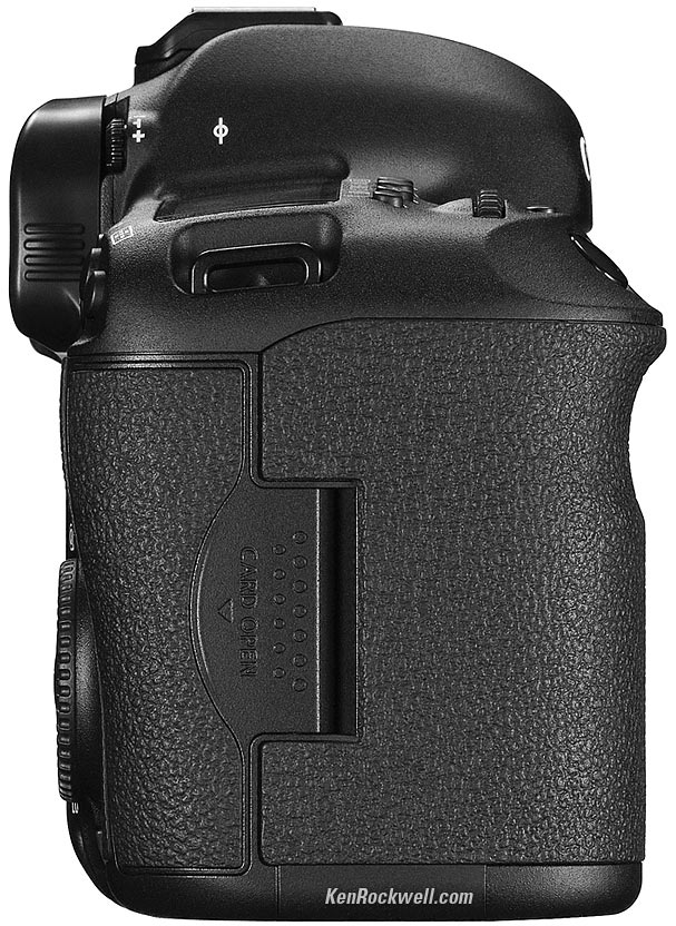 Ergonomics performance top The feel is better than any previous 5D. It's comfortable held horizontally of vertically. The playback controls are still far from perfect, but much, much better than previous cameras. There are a lot more menus than earlier cameras. For instance, there are five just for the autofocus settings! It's not obvious until you work with it, but the darn 5D Mark III has completely rounded corners! There's not a hard edge on it. Only Canon seems to know how to make solid magnesium feel soft, thank you! There are so many features that Canon now has the dubious distinction of being the first to require double-sequential button pushes to make some functions happen! For instance, at default settings, you now have to tap the [-|-] button, and then press the M-Fn button repeatedly to select among AF Area modes. This is bad, but piddle in the menus, and you can improve some of this. There are too many identical buttons next to each other on the back, without tits to identify them by feel. No longer can we set the SET button to access the Quick Control ("Q") screen. Now there is a dedicated [Q] button. Unlike using the SET button to do the same thing, now have to do a thumb dance from [Q] back to SET as we use the rear LCD to set the camera. The Q screen should repeat the specifics of user-set picture controls, but it doesn't. You must go deeper into menus to see that. (It does show the settings from the other named Picture Controls.) The ISO is not shown in the finder while adjusting it manually; you have to pull your attention away from shooting and look at the rear or top LCD. The Q screen no longer can be used to set the AF area modes; now they only can be set while looking through the finder. This sounds good, until you realize that the Focus Modes (AI SERVO, SINGLE-SHOT, AI FOCUS) can only be set in other places. In other words, you can't set the AF system until after you've looked and set these in two different places! Canon's usual idiotic manual WB setting still requires about 10 steps. The 5D Mark III still has only one memory; I think some PowerShots have two, and Nikons have five. These are important for people who shoot in varied lighting, which means anyone who shoots at ultrahigh ISOs. The Mark III still uses a cheesy rubber eyepiece cover. It's more rounded than the one on the Mark II, but I suspect they are all interchangeable. I always had a huge problem with the the power switch turning itself off or deactivating the rear dial on my original 5D and Mark II. The Mark III's new switch fixes this. It's a HUGE improvement, and another reason I love the Mark III. The locking mode dial of the Mark III may also be placing another obstacle between me and my photos. One finger used to be enough to spin the dial from C1 to C2 as I snapped a scenic or a kid photo, but now the lock release button requires finger gymnastics — and I've never had problems with top dials moving by themselves. The 5D Mark III takes the same batteries as my 5D Mark II, so I already had two fully charged batteries ready to go the instant it arrived, with no need to buy another spare, yay!