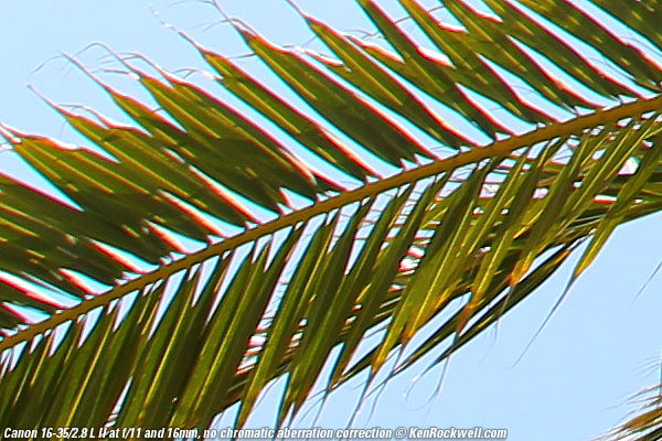 Color Fringes (Lateral Chromatic Aberrations) A first in Canon full-frame, this 5D Mk III can correct color fringes, and it works great — but only if Canon has a profile for your lens available, and then only if you have it loaded in your camera. This new correction in the 5D Mark III makes a world of difference in real photos with the lenses that need it and have in-camera profiles. You will see the improvement in real photos: the color fringes go away. This is with in-camera JPGs: