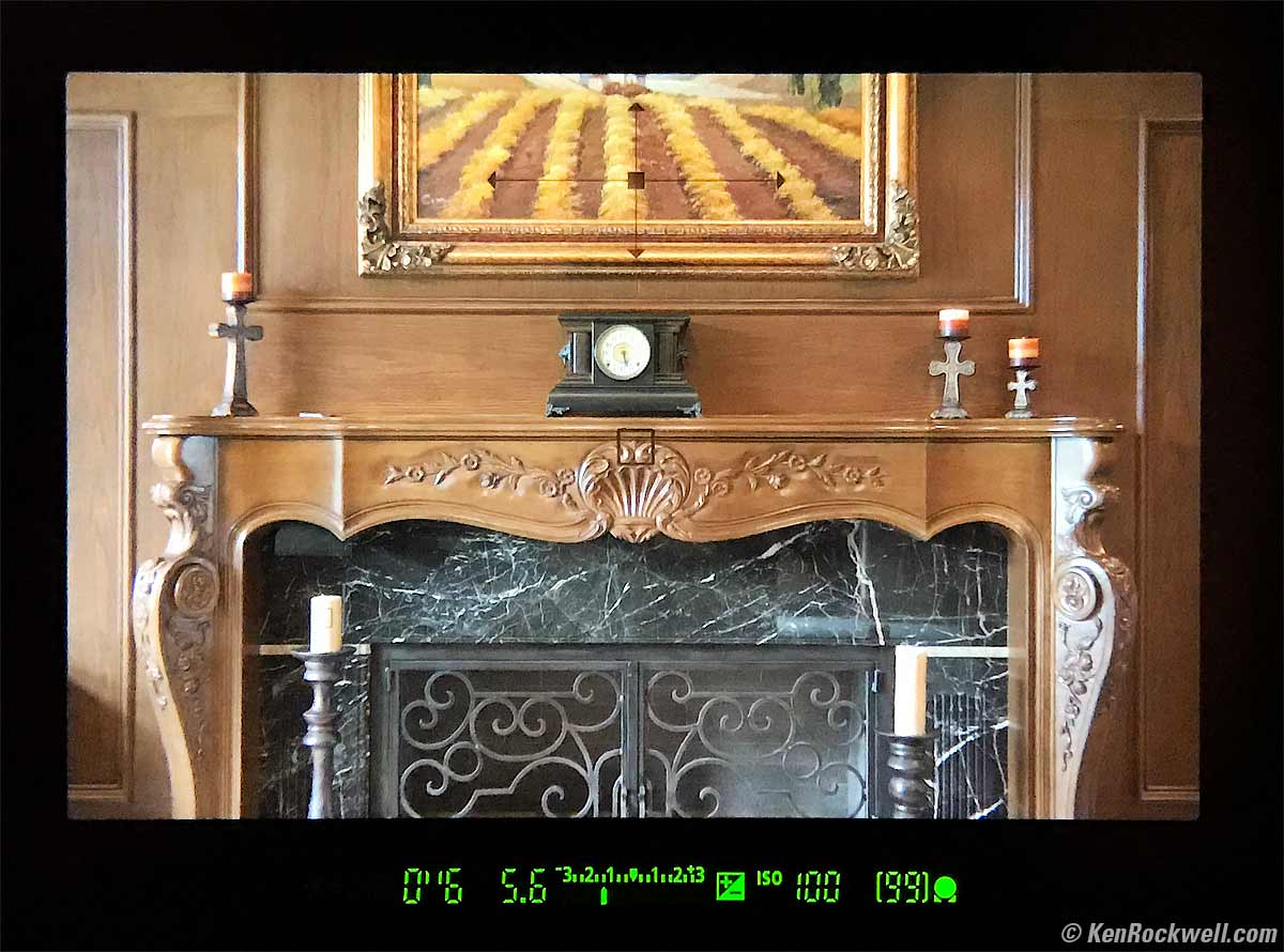 FinderActual view through Canon 5D Mk IV viewfinder. Note 2-axis level display at top. bigger. The active AF areas are black LCD boxes that can block our view of the subject. They can light in red in the dark, but it's nowhere near as nice as the true LED active AF areas of the 1DX Mk II. There are also settable dark LCD text overlays along the bottom of the ground glass to warn of various settings.