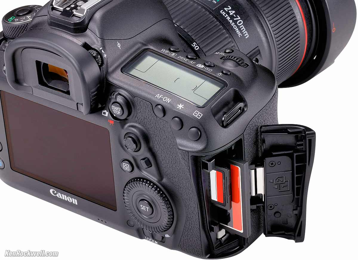 Storage specifications topCanon 5D Mk IV CF and SD card slots. bigger. One CF and one SD slot. Work either as one card at a time, or to overflow to the next card as needed, or to record different image formats or sizes on each, or my favorite, recording the same thing to both as a real time backup.