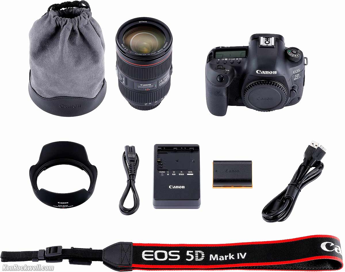 Canon 5D Mk IV. bigger. 5D Mk IV body. Body cap. Strap. Eg eyecup. LP-E6N battery. LP-E6 Charger (folding plug without cord in USA) IFC-150U USB 3 cord. Software disk. English and Spanish printed manuals. (Lens, hood and sack if part of a kit.)