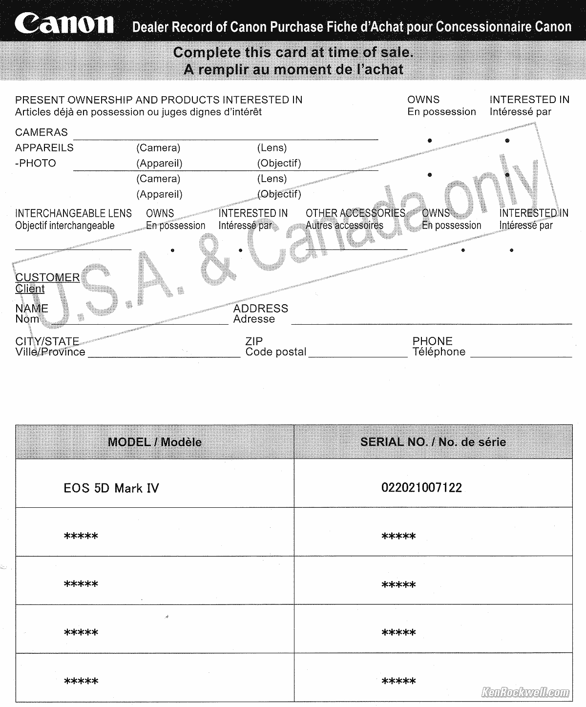 Getting a Legal USA Version (for USA only) Top Intro Compatibility Specifications Accessories USA Version Performance Compared Usage Recommendations More I got my 5D Mk IV at Adorama; I'd also get it at Amazon, at B&H or at Crutchfield, or used at eBay if you know How to Win at eBay: Body only: $2,099 at Adorama, at Amazon, at B&H and at Crutchfield, or about $980 used if you know How to Win at eBay. Body with 24-105mm f/4 L IS II: $3,399 at Adorama, at Amazon, at B&H and at Crutchfield. BG-E20 Battery Grip: $299. USA versions include a white Canon USA warranty card marked "U.S.A & Canada only." It lists the serial numbers of whatever's in the box: Canon USA Warranty Card. bigger. If yours has no USA card, you got ripped off with a gray market version from another country. This is why I never buy anyplace other than from my personally approved sources. You just can't take the chance of buying elsewhere, especially at any retail store, because non-USA versions have no warranty in the USA, and you won't even be able to get firmware or service for it — even if you're willing to pay out-of-pocket for it when you need it! If a gray market version saves you $1,000 it might be worth it, but if saving only $100 I wouldn't risk having no warranty or support. Always be sure to check yours while you can still return it, or just don't buy from unapproved sources or at retail so you'll be able to have your camera serviced as needed. Get yours from the same places I do and you won't have a problem, but if you take the risk of getting yours elsewhere, be sure to check everything while you still can return it.