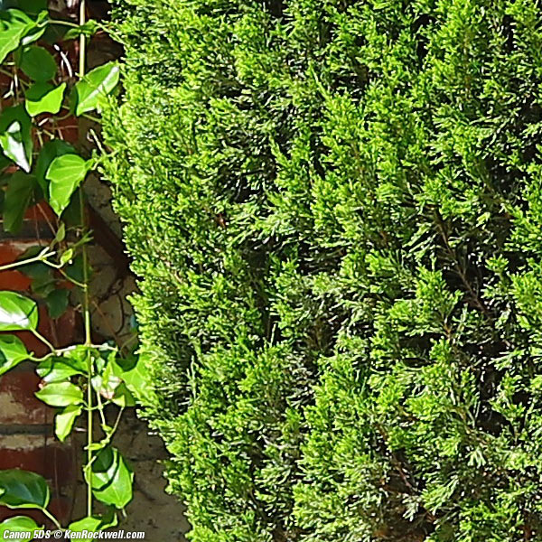 Analysis I shot with the same manual exposure to catch if either camera was cheating. No, both have the same actual speed when set to ISO 12,800. It turns out that they perform the same at ISO 12,800, exactly as I expected. While different cameras will have different trade-offs between noise and texture (some cameras use more noise reduction to show less noise but also show less detail), most cameras of similar brand and vintage show the same high ISO performance at the same optical magnification. I expected that both would be the same, and that Canon simply locked-out higher ISOs in the 5DS to encourage people to buy the other Canon cameras as well for low-light work. I was right: they look the same at ISO 12,800; you can't set the 5DS above 12,800, but you can set the 5D Mk III above 12,800, at which point it looks worse and worse and worse. If you look for subtleties, the 5DS shot set down to 22MP isn't quite as sharp as the 5D Mark III when shot at ISO 12,800. Curious, I shot the 5DS at its maximum resolution and downconverted the 50MP images back to the same 22MP size in Photoshop CS6's Image Resize command. Lo and behold, shooting the 5DS at 50MP and converting later to the same resolution as the 5D Mk III gives a slightly sharper and better image. The 5DS image has a bit more noise, and a lot more subtle texture than the 5D Mk III image. Don't fret these minor differences; what I've shown is that the 5DS has the same low-light ability as other Canon full-frame cameras — and that you don't need to buy another camera for use at high ISO. If you want to see how bad the 5D Mk III looks at higher ISOs, look at its review for samples (obviously shot at a different time). You can push the 5DS to above ISO 12,800 using Photoshop. I haven't tried it; ISO 6,400 is good enough for me to shoot hand-held in moonlight.