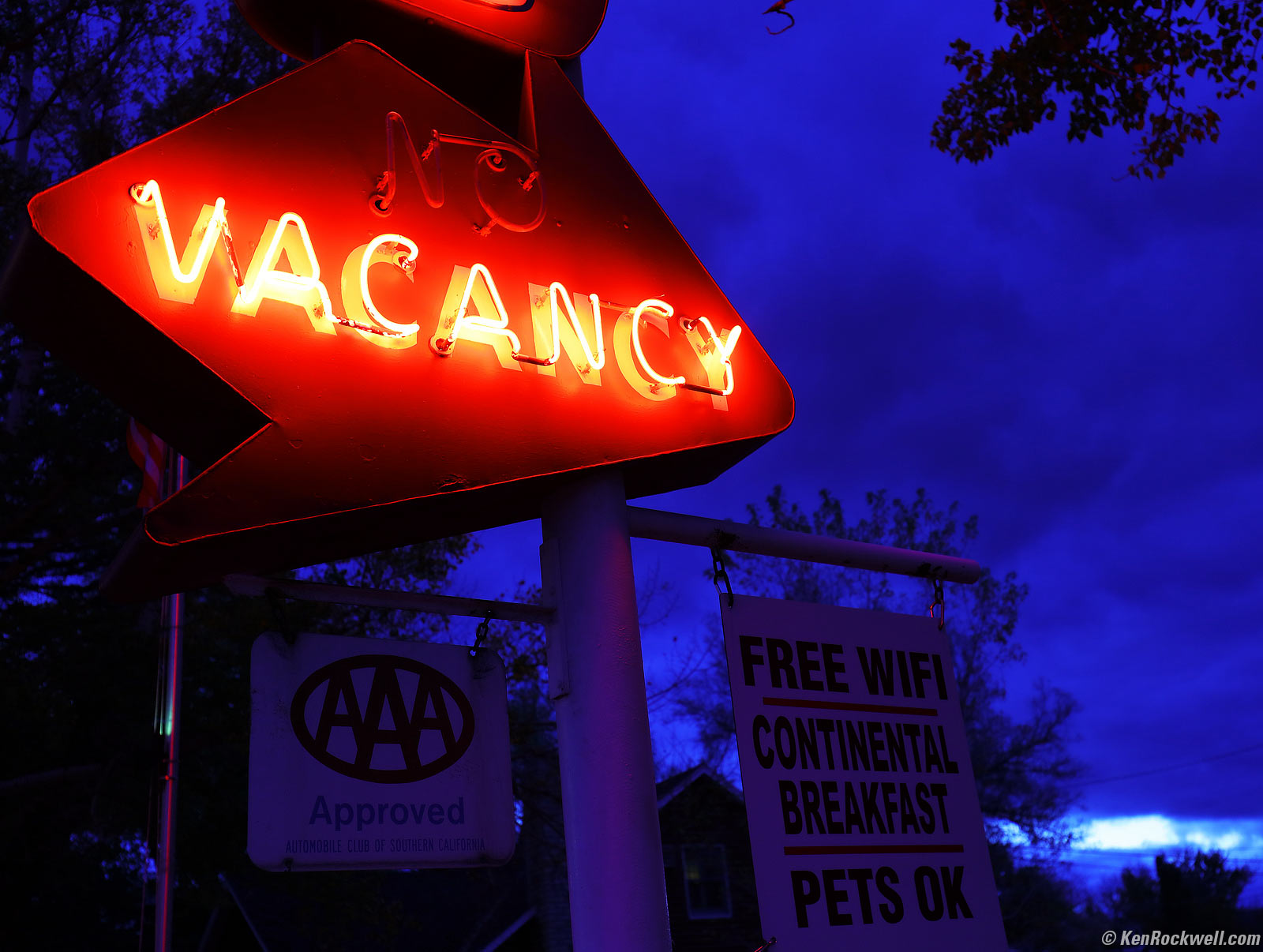 Red Neon Vacancy Sign, Bridgeport, October 2015, 6:26 P.M. Canon 5DS R, Canon 16-35mm L IS at 35mm, f/4 hand-held at 1/10 at Auto ISO 200, Perfectly Clear. bigger.