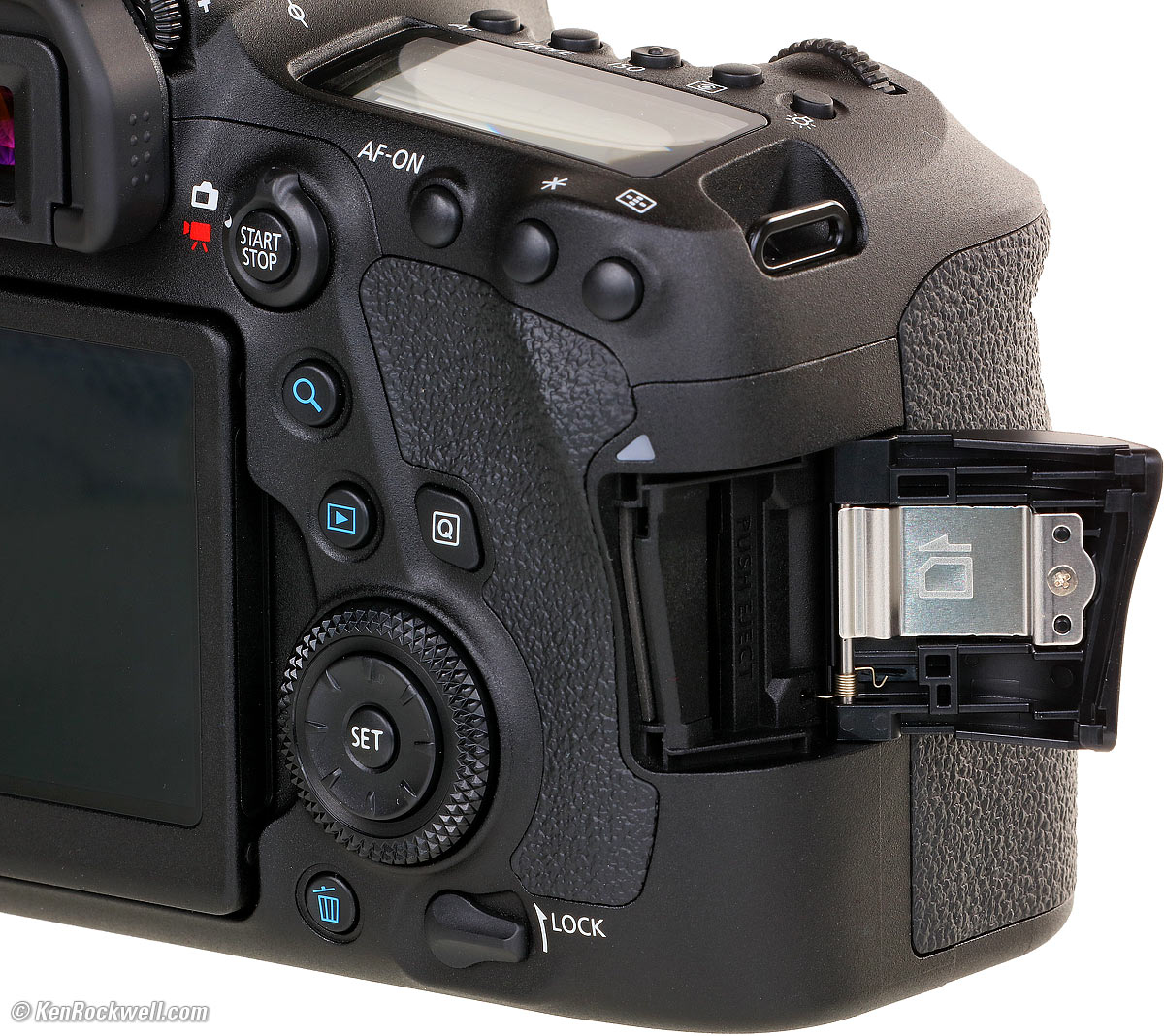 ErgonomicsErgonomics are typical Canon, which is very, very good. There is a My Menu menu which is easy to set up, and once you do, it's easy to get there and set what you need super-fast. Also great is the QUICK screen (press the [Q] button) from which you can set most shooting settings. The touch screen makes settings easy, especially for entering text information. The rubbery grip material is the best in the industry. It's super grippy, yet firm. It's as if it's made of the same nanomaterial as the footpads of a lizard that grip anything without being sticky. A few minor annoyances are: The shiny chrome lettering on the top left mode dial can make the markings difficult to read in direct sunlight. Worse, the important C1 and C2 modes have their letters even smaller inside tiny little silver squares, so they are difficult to read most of the time. The LOCK lever on the back, which locks-out the command dials, can get knocked accidentally to LOCK depending on how you carry your 6D Mk II around your neck. This lever is in a similar position to the power lever of the original 5D, which would often turn itself off when carried around your neck.