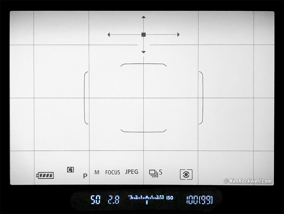 FinderThe finder is wonderful. Everything is big, bright, sharp and clear. You have many menu options to turn grid lines and a level on and off, as well as each of many different status icons along the bottom. In this view, I have them all turned on. The cross at the top is the level, which shows dots in various directions if you're out of level: Actual view through Canon 6D Mk II finder. bigger.