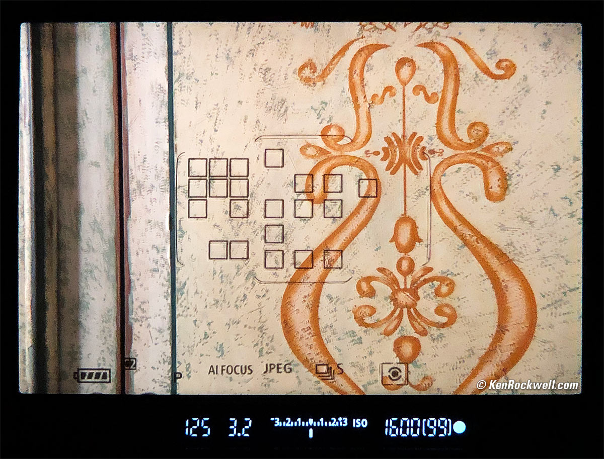 The only bad thing about the finder is the same as with all other consumer DSLRs up to and including the 5DSR: all the markings are made with dark LCD lines that block whatever might be behind them. Pro cameras like the 1DX use red LEDs that don't block anything. The 6D Mk II's finder markings are side-lit in red in the dark, but they are side-lighting the LCD, and still block the subject. AF zones show in black and may cover up a face while you're waiting for a smile: Actual view through Canon 6D Mk II finder. bigger.