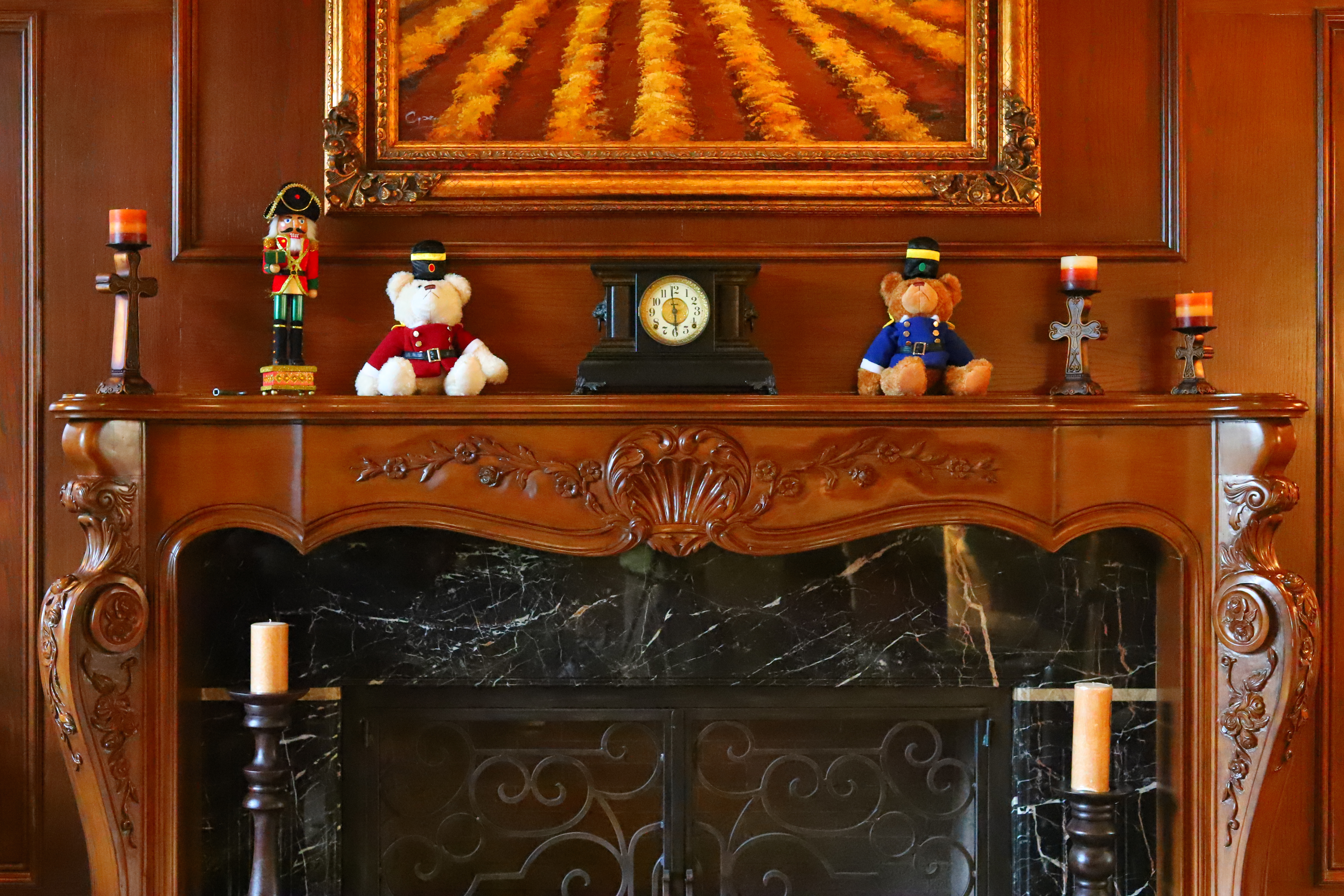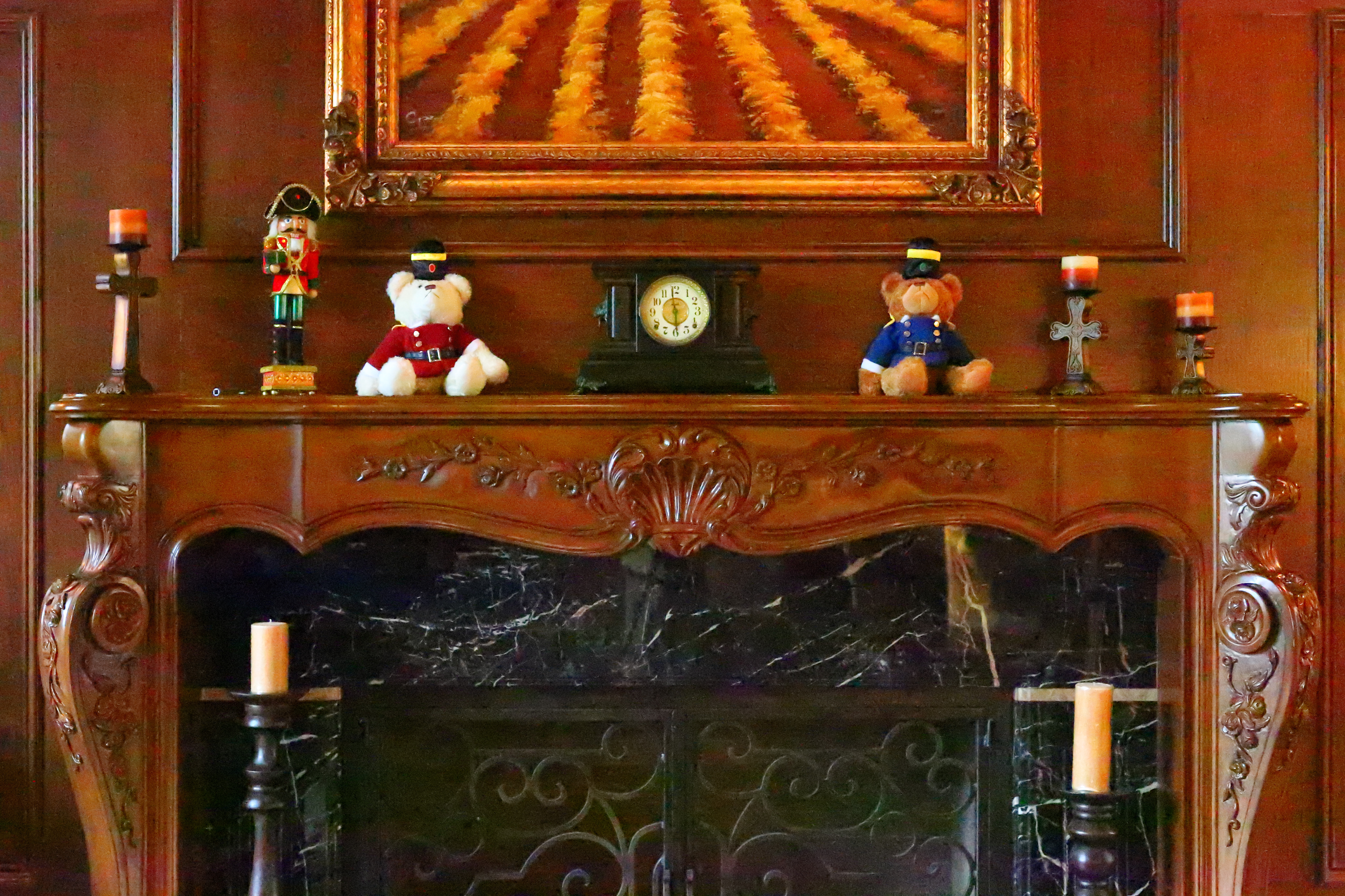 Crops from aboveThese are 600 × 450 pixel crops that vary in size to fit your browser window. If they are about 6" (15cm) wide on your screen, the complete image would print at 41 × 62" (105 × 160 cm) at this same magnification. If they are about 12" (30cm) wide on your screen, the complete image would print at 83 × 125" (2.1 × 3.2 meters) at this same extreme magnification! Obviously we're looking very closely here. As with all modern digital cameras, we lose fine details and textures as ISO climbs. It doesn't get that much noisier; what happens is that increasing levels of noise reduction are used to smooth-over the noise at higher ISO, and it removes subject texture and details with the noise. Noise reduction removes fine subject textures first, and only removes hard edges edges at the highest ISOs. ISO 50 shows the most texture and detail in the wood grain behind the clock. As ISO climbs we lose these subtle details in the brown wood. By ISO 800 we're starting to lose detail in the egg-and-dart embossing in the clock's outer gold band, and the ornamental lines are starting to disappear from details in the the clock's black woodwork. By ISO 6,400 most of the details are gone from all of the wood. By ISO 25,600 even hard edges are starting to disappear. The minute marks on the clock face are erased by the noise reduction, and the big number are starting to get chipped away. By ISO 51,200 (H1) the clock numbers are starting to get colored, and color smears are visible. At ISO 102,400 (H2) the image is mottled, parts of the big clock face number are missing, and the lion head on the left of the clock is unrecognizable as a lion. Click any for the same camera-original © files as above to explore on your computer (mobile devices rarely show the full resolution files properly: Click any for the same camera-original © files as above to explore on your computer; mobile devices rarely show the full resolution files properly.