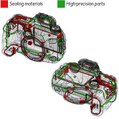 Body specifications topFrame: Aluminum alloy and polycarbonate resin with glass fiber. Exterior: Polycarbonate resin with special conductive fiber & Polycarbonate resin with glass fiber on some parts. Canon claims some weather sealing: Canon 6D Mk II seals.