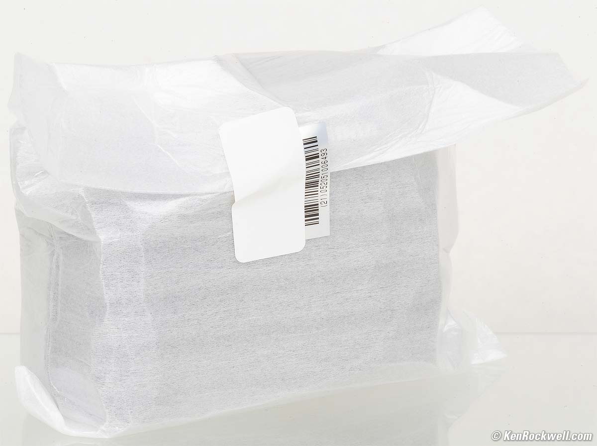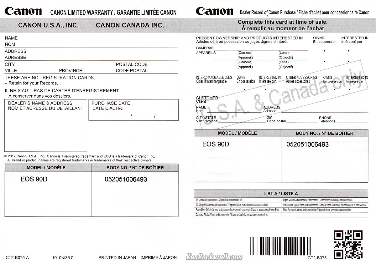 Your box must include a U.S.A. warranty card like the one shown above from Canon U.S.A., Inc. It should be on top inside your box as you open it. The serial number on the card must match the serial number on the sticker on the bottom of your 90D: Canon 90D Serial Number Sticker. bigger. If you don't have a printed USA warranty card or the number doesn't match, you got ripped off with a gray market version from another country. This is why I never buy anyplace other than from my personally approved sources. You just can't take the chance of buying elsewhere, especially at any retail store, because non-U.S.A. versions have no warranty in the USA, and you probably won't be able to get firmware or service for it — even if you're willing to pay out-of-pocket for it when you need it! Shifty dealers may include copies of a card from a different legitimate U.S.A. camera, hoping you won't check serial numbers and catch their fraud. A card with the wrong serial number means nothing other than that you have no warranty coverage. Canon even puts the same serial number on the bag inside the box: Canon 90D Shipping Bag. bigger. This bag looks like it's sealed with stickers, but it's easy to open and reclose without damaging anything; thus it's not actually sealed. The serial numbers on the outside of the box (near the bar codes) or the bag don't have to match for you to have warranty coverage, but they should. If they don't, it means a shifty dealer took things out of boxes and was too sloppy to put them back correctly — and it means you got a used camera and are entitled to a huge discount if anyone other than you took it out of the box. If a gray market version saves you $500 the risk might be worth it, but for $200 or less I wouldn't risk having no warranty or support. Always be sure to check yours while you can still return it, or just don't buy from unapproved sources or at retail so you'll be able to have your camera serviced and get free updated firmware as needed. Get yours from the same places I do and you won't have a problem.