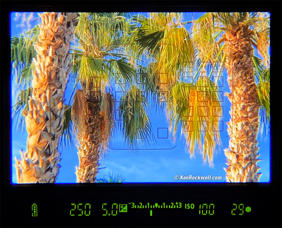 Finder performance topMy picture of the finder doesn't do it justice: Actual View Through Canon 90D Finder. bigger. The actual finder image is super sharp, bright and contrasty, much better than any mirrorless camera and much better than the real-life photo above makes it appear. The reason some people like mirrorless is because their finders can show menus and playback and even zoom in for focus checking as you shoot, while of course this live optical image is always the actual image as seen directly through the lens with no electronic processing. There are many choices of warnings and displays that overlay as gray LCD icons over the clear image. The adjustable diopter stays in focus; it's not where it get knocked and it's easy to adjust when you want to. An innovation is a little camera-tilt icon that can be enabled in the lower left. It lets us level our camera, but doesn't cover up half the finder as it does in other cameras. Bravo!