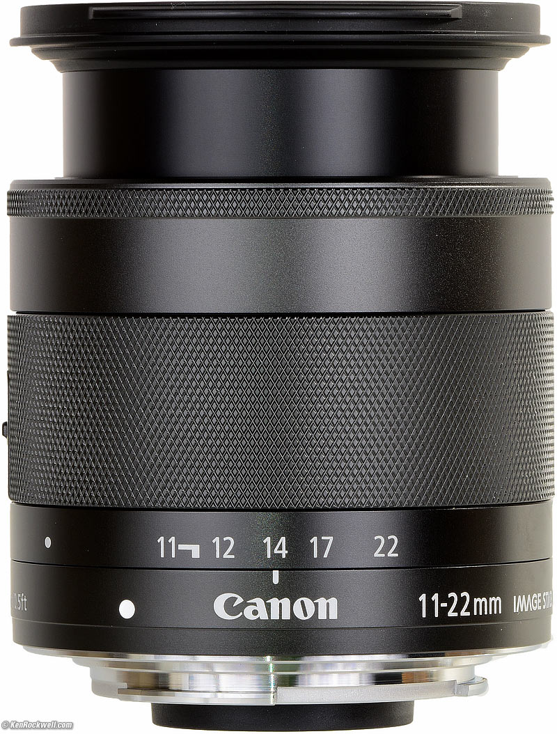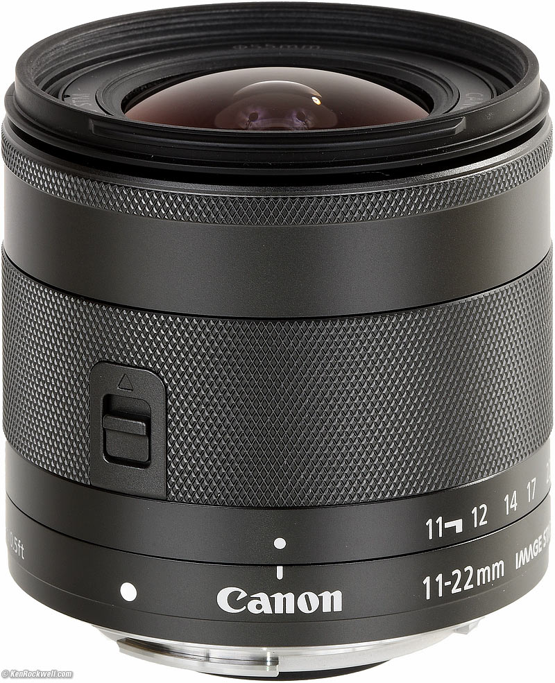 IntroductionTop Sample Images Intro Compatibility Specifications Performance Compared Usage Recommendations More The Canon EF-M 11-22 IS STM is a very high performance ultrawide zoom for Canon's EOS-M system. It's near optically perfect as used on the EOS-M system. It also has remarkable macro abilities, focussing continuously from infinity to within 2" (5cm) in front of the lens. It's a compact little lens that retracts to become about a half inch (15mm) shorter when carried. It has plastic innards and a metal outer shell. It has an electronic manual focus ring, that if activated in the menu system, can allow manual focus. Note that with a camera system that's usually held at arm's length I can't see how you'd ever want to use this mode; nothing is ever that far out of focus with a lens this wide.