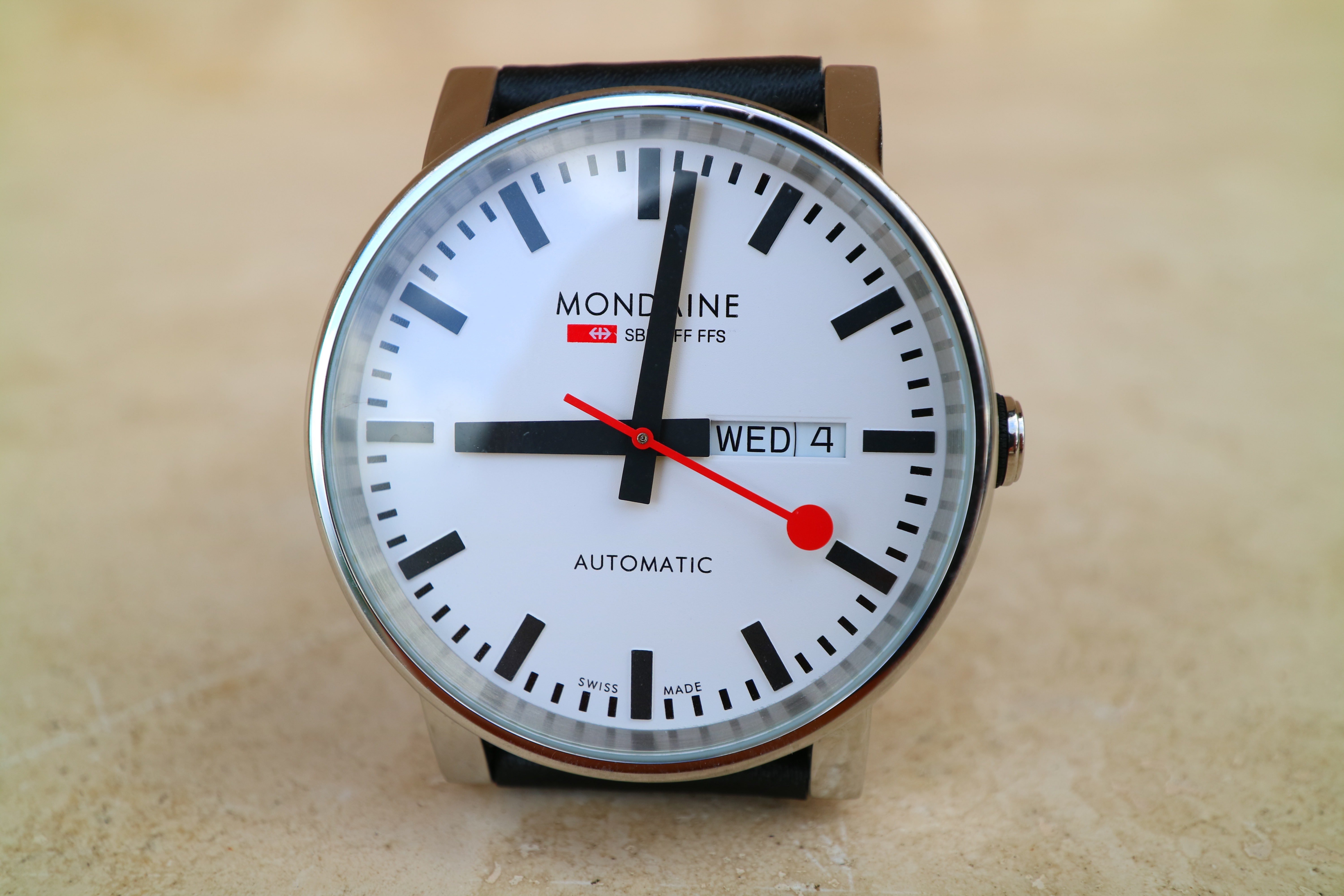 Mondaine A1323034811SBB at close-focus distance at 22mm wide-open at f/5.6. bigger or camera-original to explore on your computer (most portable devices can't show all the pixels in the full resolution file).