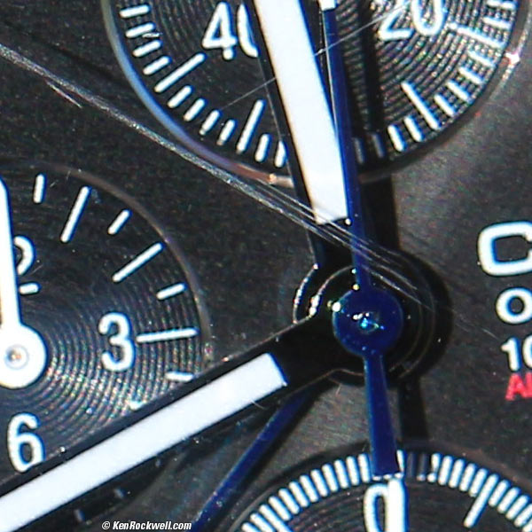 Macro performance top Macro gets close at 55mm: At close-focus distance, f/9 at 1/200 at ISO 100 on EOS-M, +3 saturation, 6 sharpening. It gets close, but it's not as sharp as the 22/2 STM at macro distances: Crop from above image at 100%, 18 MP EOS-M. If this is 6" (15cm) on your screen, the complete image would print at 52 x 35" (135 x 90 cm) at this same magnification. You can see the scratches on my watch crystal. It's nearly impossible to tell the EOS-M on what to focus for macro shooting; in this case, it seems to be focused on the scratch on the top of my watch.