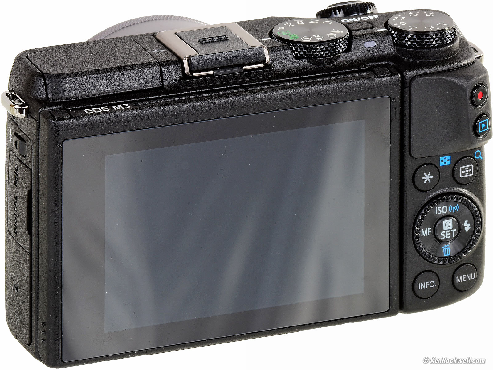 ErgonomicsPerformance top of EOS M3 review It has two command dials: one cleverly around the shutter release, and another around the rear four-way controller. The built-in grip works great; it's grippy and fits my American hands. The C mode is programmable and saves your settings, while the P and other modes all can be set separately, so it's easy to swap between two completely different sets of settings. The shutter is noisier than I'd like, making this an inelegant copy of an iPhone. Too many buttons have more than one function. This confuses when you expect one thing and now the same button does something different. It also seems to have two different "Q" screens depending on how you get into them. This is also confusing. There are too many similar screens. Sometimes the touch-activated "Q" screen won't clear when you press the shutter and want to take a picture. it always seems to wake in its own favorite display mode. If you prefer a different Live View mode, you'll always have to tap the INFO button a few times to get to your favorite. There is no slow continuous shutter mode. The regular 4.2 FPS mode is so fast it will give two frames when I'm trying to hold the shutter steady for a long exposure. The Program mode seems to pick odd combinations at times, tending towards faster shutter speeds. The flip LCD is great, and lets me shoot from any angle easily. The flash release lever goes the wrong way; I have to push it away from me to pop up the flash.