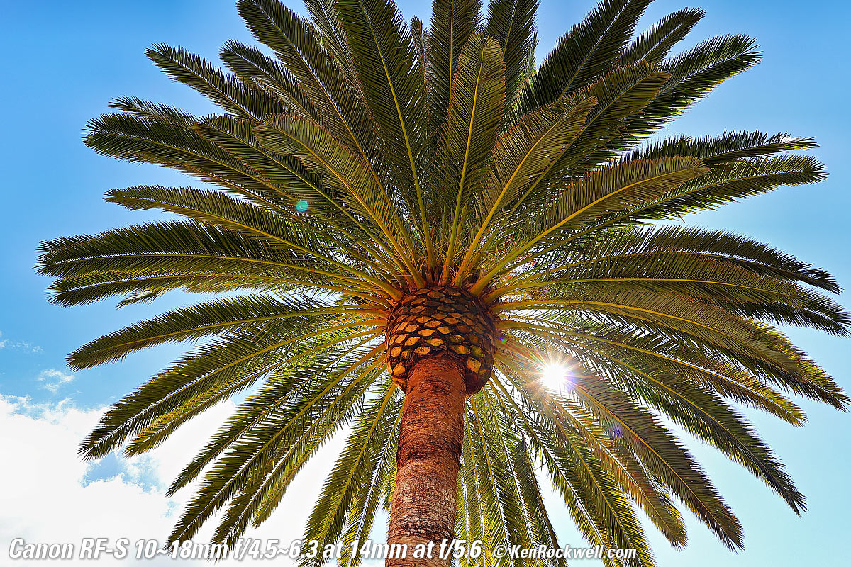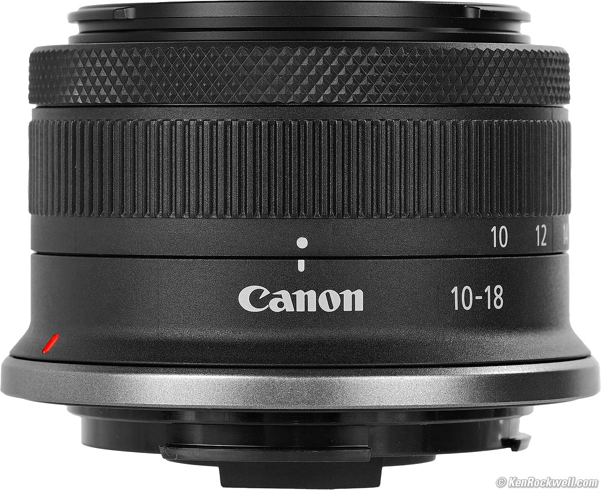 Recommendations topSample Images Intro New Good Bad Missing Compatibility & Format Specifications Accessories Performance Compared I got my RF-S 10-18mm at B&H. I'd also get it at Adorama, at Amazon or at Crutchfield, or used at eBay if you know How to Win at eBay. GET ONE! This lens is awesome, and nearly free. It's tiny, sharp, stabilized and I can't say enough good about it. This is for APS-C cameras; on full frame ideally use the RF 15-30mm IS STM instead. I use a clear (UV) protective filter instead of a cap (exactly like an iPhone) so I'm always ready to shoot instantly. I only use a cap when I throw this in a bag with other gear without padding — which is never. The UV filter never gets in the way, and never gets lost, either. The very best protective filter is the Multicoated Hoya HD3 49mm which uses hardened glass and repels dirt and fingerprints. The LEICA faithful use the LEICA 13 035 49mm UVa II filter. Fuji sells a PRF-49S filter if you prefer. For less money, Canon makes a great 49mm UV filter, and the multicoated B+W 010, the Hoya NXT Plus multicoated and the basic multicoated Hoya filters are all optically superb, while the Hoya HD3 is the toughest and therefore the best. Filters last a lifetime, so you may as well get the best. The Hoya HD3 stays cleaner than the others since it repels oil and dirt. All these filters are just as sharp and take the same pictures, the difference is how much abuse they'll take and stay clean and stay in one piece. Since filters last a lifetime or more, there's no reason not to buy the best as it will last you for the next 40 years. Filters aren't throwaways like digital cameras which we replace every few years, like it or not. I'm still using filters I bought back in the 1970s! I got my RF-S 10-18mm at B&H. I'd also get it at Adorama, at Amazon or at Crutchfield, or used at eBay if you know How to Win at eBay. This 100% all-content, junk-free website's biggest source of support is when you use those or any of these links to my personally approved sources I've used myself for way over 100 combined years when you get anything, regardless of the country in which you live — but I receive nothing for my efforts if you take the chance of getting it elsewhere. Canon does not seal its boxes in any way, so never buy at retail or any other source not on my personally approved list since you'll have no way of knowing if you're missing accessories, getting a defective, damaged, returned, dropped, incomplete, gray-market, store demo or used lens — and my personally approved sources allow for 100% cash-back returns for at least 30 days if you don't love your new lens. I've used many of these sources since the 1970s because I can try it in my own hands and return it if I don't love it, and because they ship from secure remote warehouses where no one gets to touch your new lens before you do. Buy only from the approved sources I've used myself for decades for the best prices, service, return policies and selection. Thanks for helping me help you! Ken.