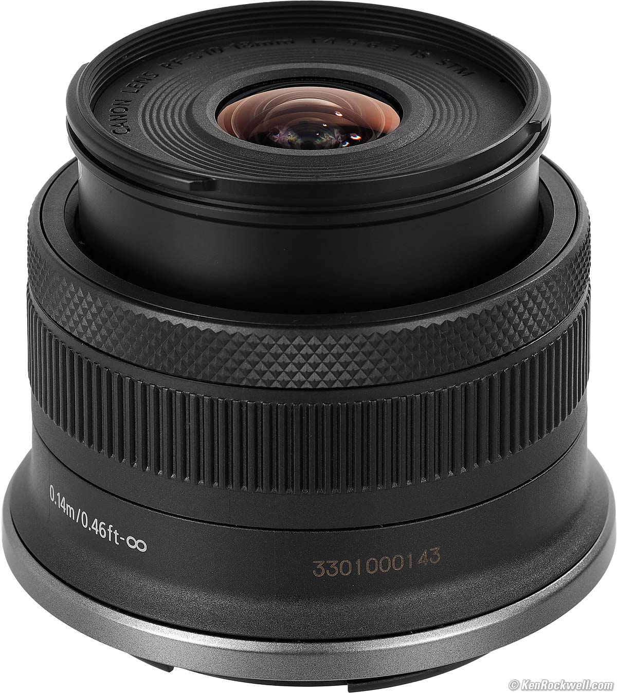Serial NumberCanon RF-S 10-18mm IS STM. bigger. Laser engraved in dark brown-on-black on bottom of barrel.
