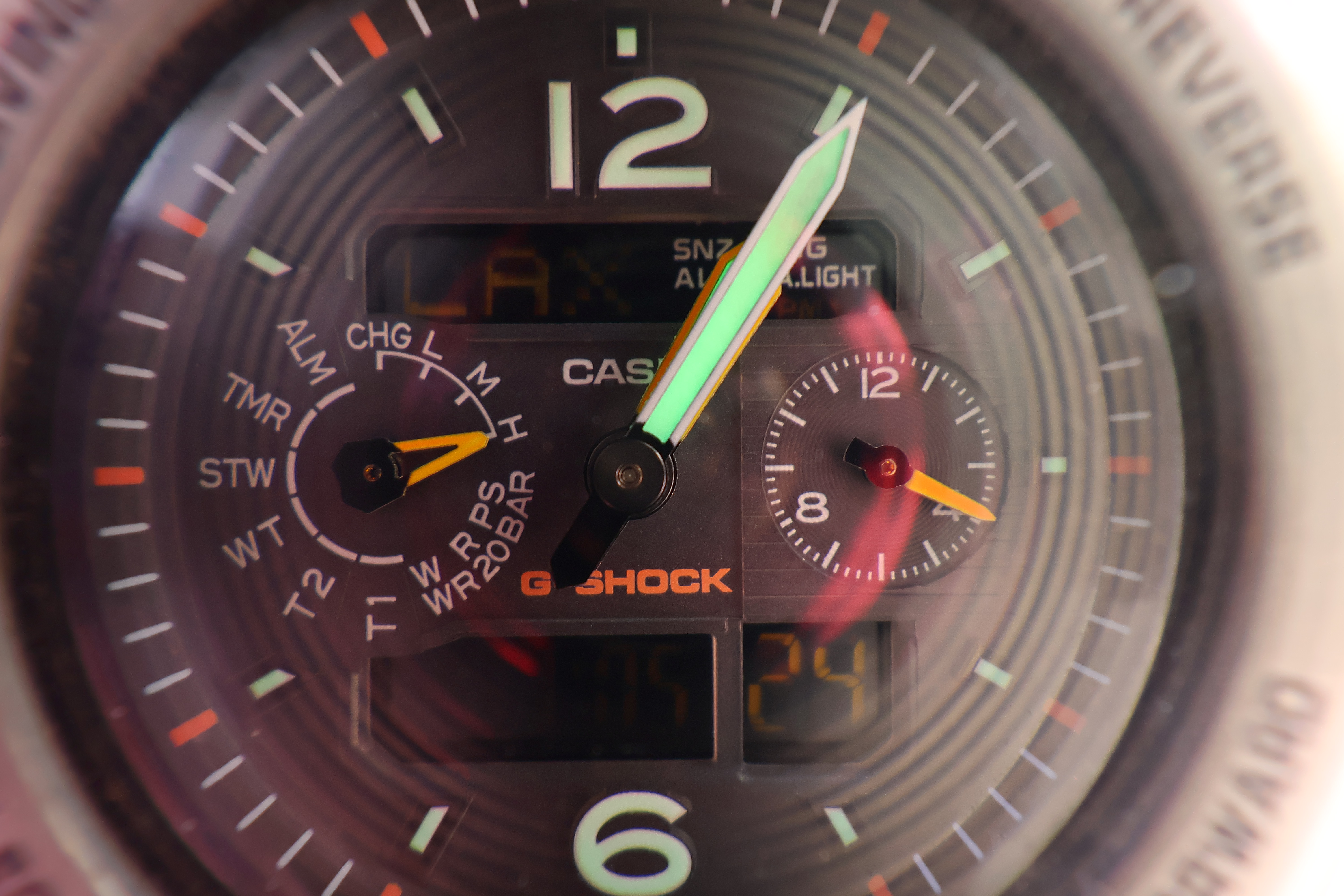 At 10mm Wide-Open at f/4.5, Manual FocusWith manual focus at 10mm it realty does focus right up to the front of the lens, so my watch is in the dark. This is why the luminous green hands are glowing green; they're in the dark: Casio G-Shock Solar Atomic Watch at close-manual-focus distance at 10mm at f/4.5, 13 February 2024. Canon EOS R10 at 1/160 at Auto ISO 100, +0.7 stops exposure compensation (LV 11.8), Radiant Photo software to add light. bigger or camera-original © file. The concentric circles are the reflection of the front of my lens in my watch crystal! The magenta rockers on either side are a reflection of the side-lit edges of my lens' front element.