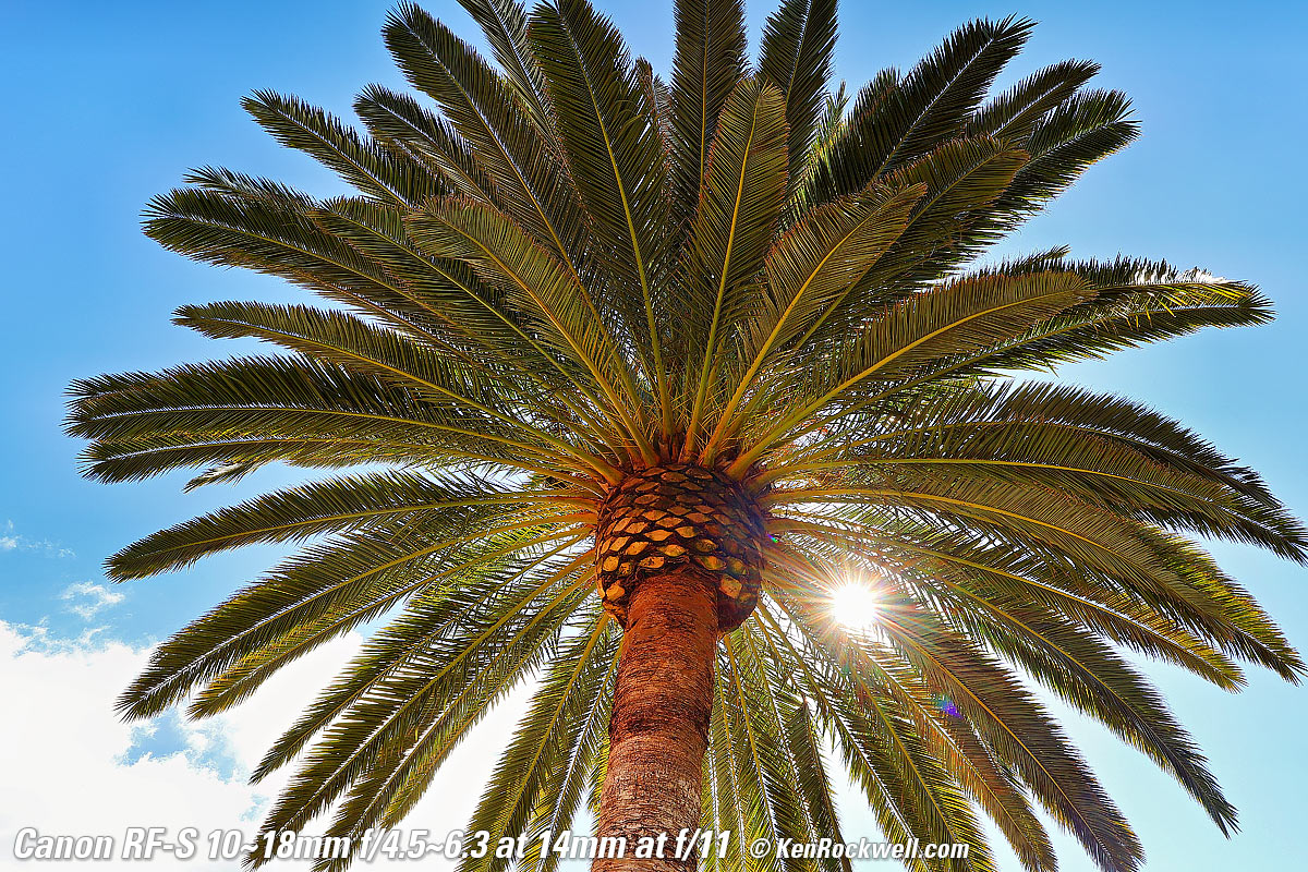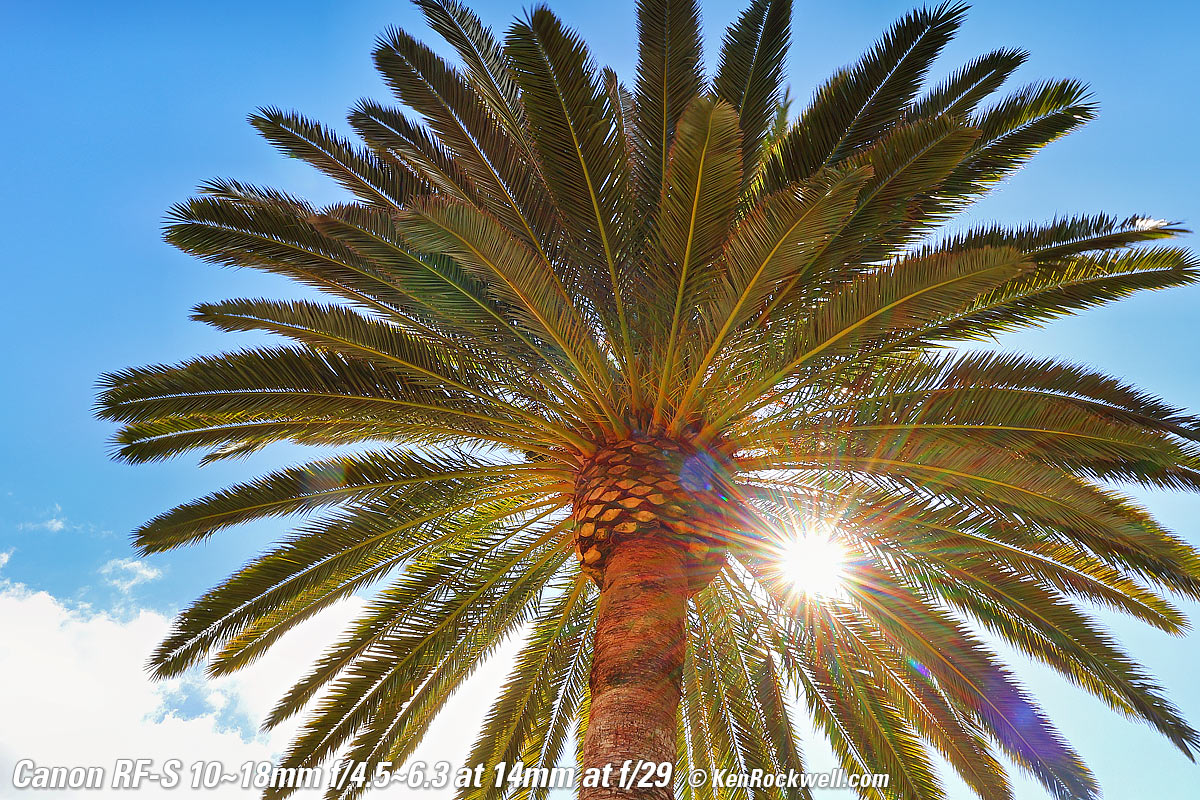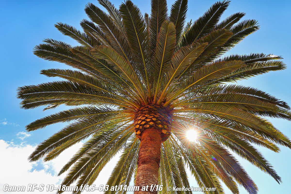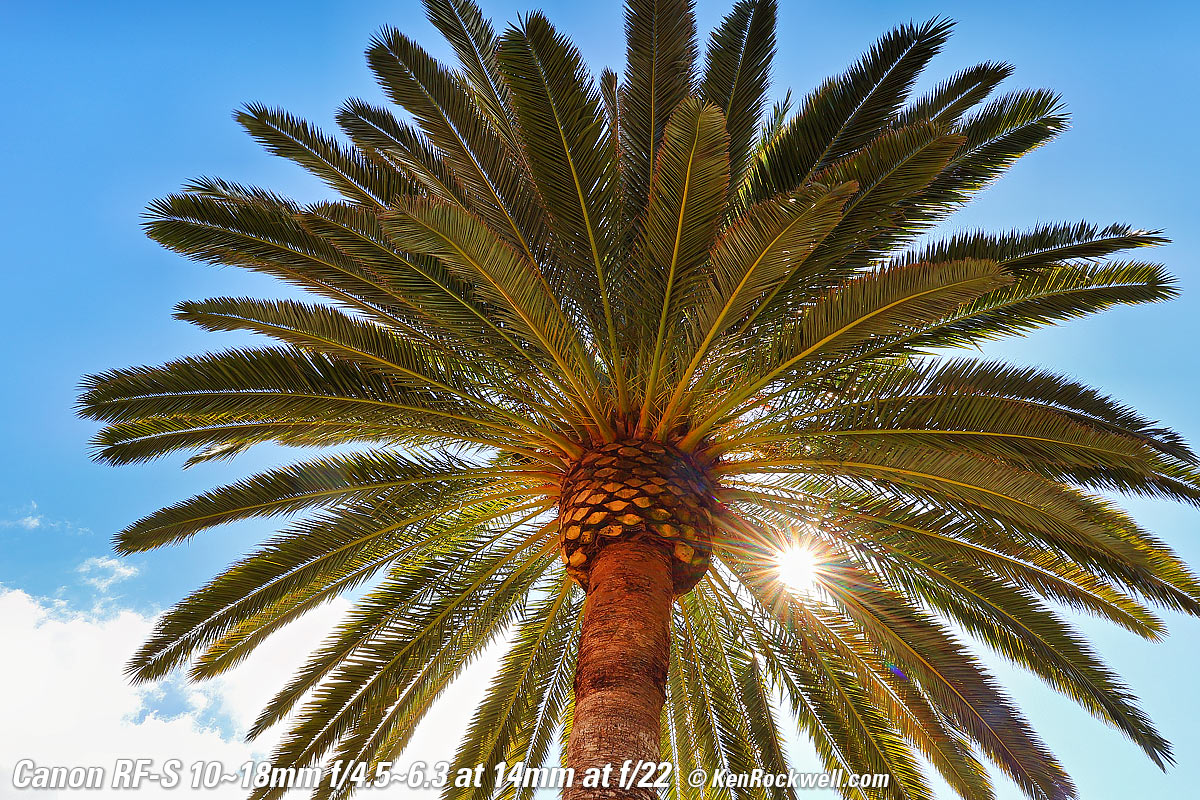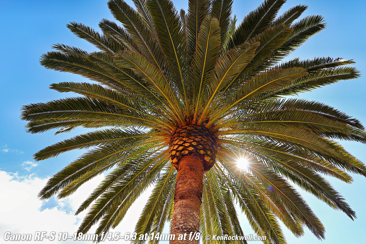 Sunstars performance topWith a 7-blade rounded diaphragm, I get mild 14-point sunstars on brilliant points of light at most apertures. Oddly at the smallest apertures it becomes a bigger, more complex and uncontrolled star. Likewise ignore the crazy rainbow dots at small apertures; these are sensor artifacts caused by taking a picture directly of the sun and exposing for the dark underside of a huge palm tree, and using that same palm tree to hide the sky to accentuate the stars. Click any to enlarge: Click any to enlarge.
